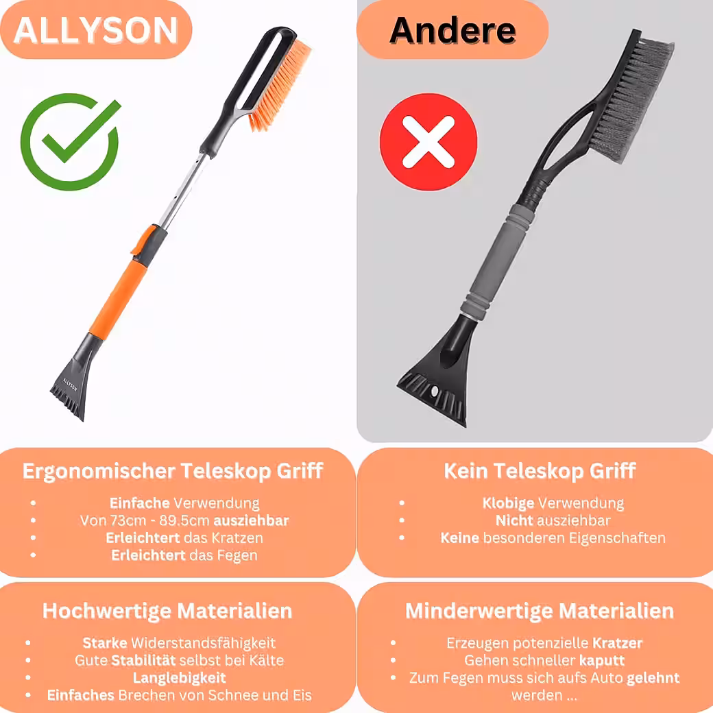 - Snow brush: The robust snow brush removes even the heaviest snow without damaging paintwork or windshield – ideal in any weather.
