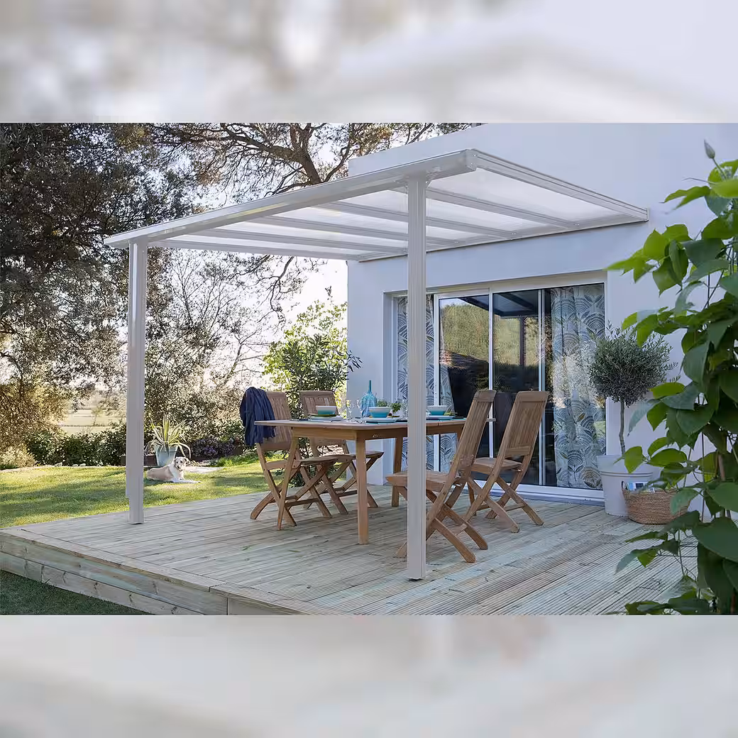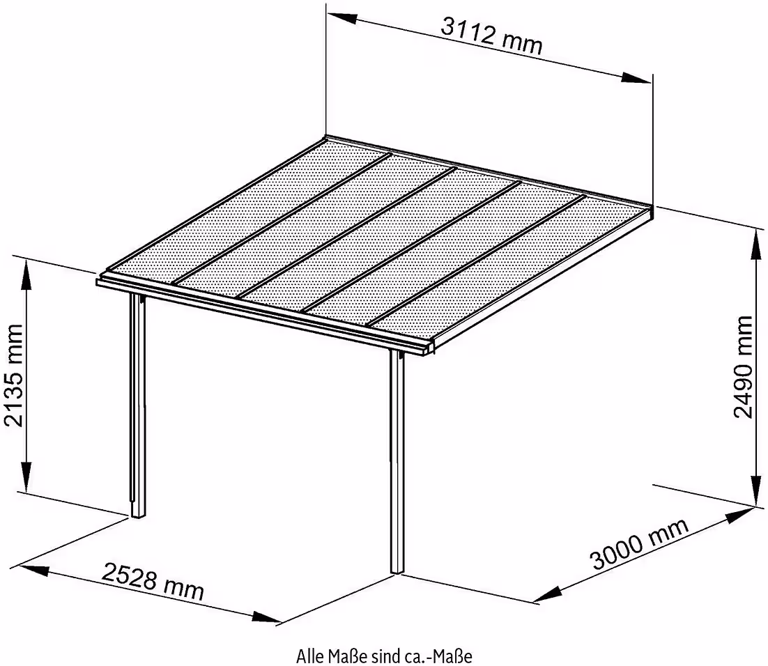 The “Trend” patio roof is an attractive, durable, and popular addition to your home. The low-maintenance construction, made of high-strength aluminum profiles, is structurally tested, and the load-bearing posts measure 80 x 64 mm. The roof is covered with shatterproof 6 mm thick polycarbonate twin-wall sheets. These “Longlife-Plus” quality sheets, with UV protection on both sides, maintain exceptionally high light transmission even after years of exposure to the elements. Delivery includes a rain gutter with downpipe and all necessary mounting hardware. Available in four sizes and two colors (anthracite gray RAL 7016 and white RAL 9010). Size 1: Length: 312 cm Depth: 250 cm Size 2: Length: 312 cm Depth: 300 cm Size 3: Length: 435 cm Depth: 250 cm Size 4: Length: 435 cm Depth: 300 cm We offer a 20-year warranty on the aluminum profiles and a 10-year warranty on the twin-wall polycarbonate sheets.