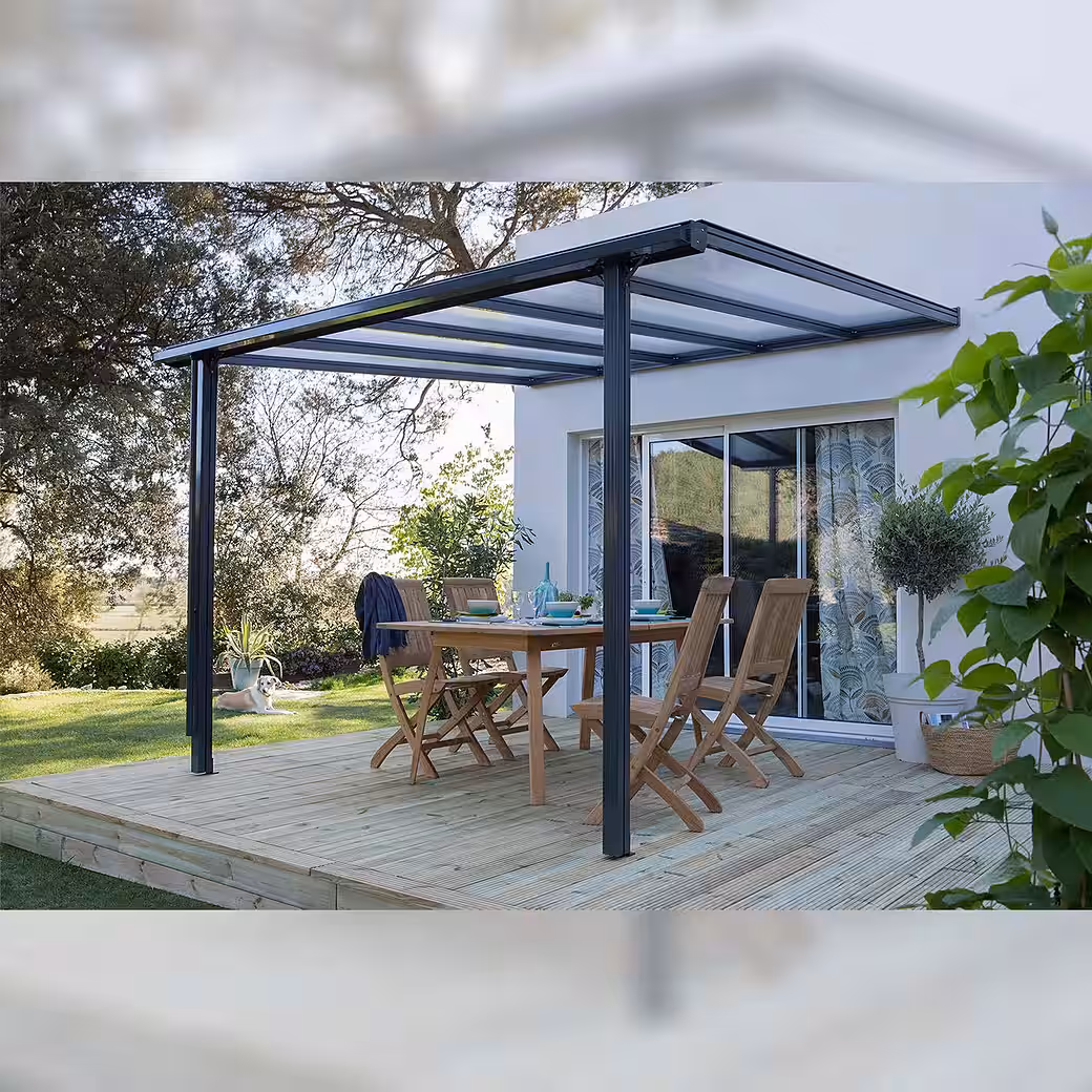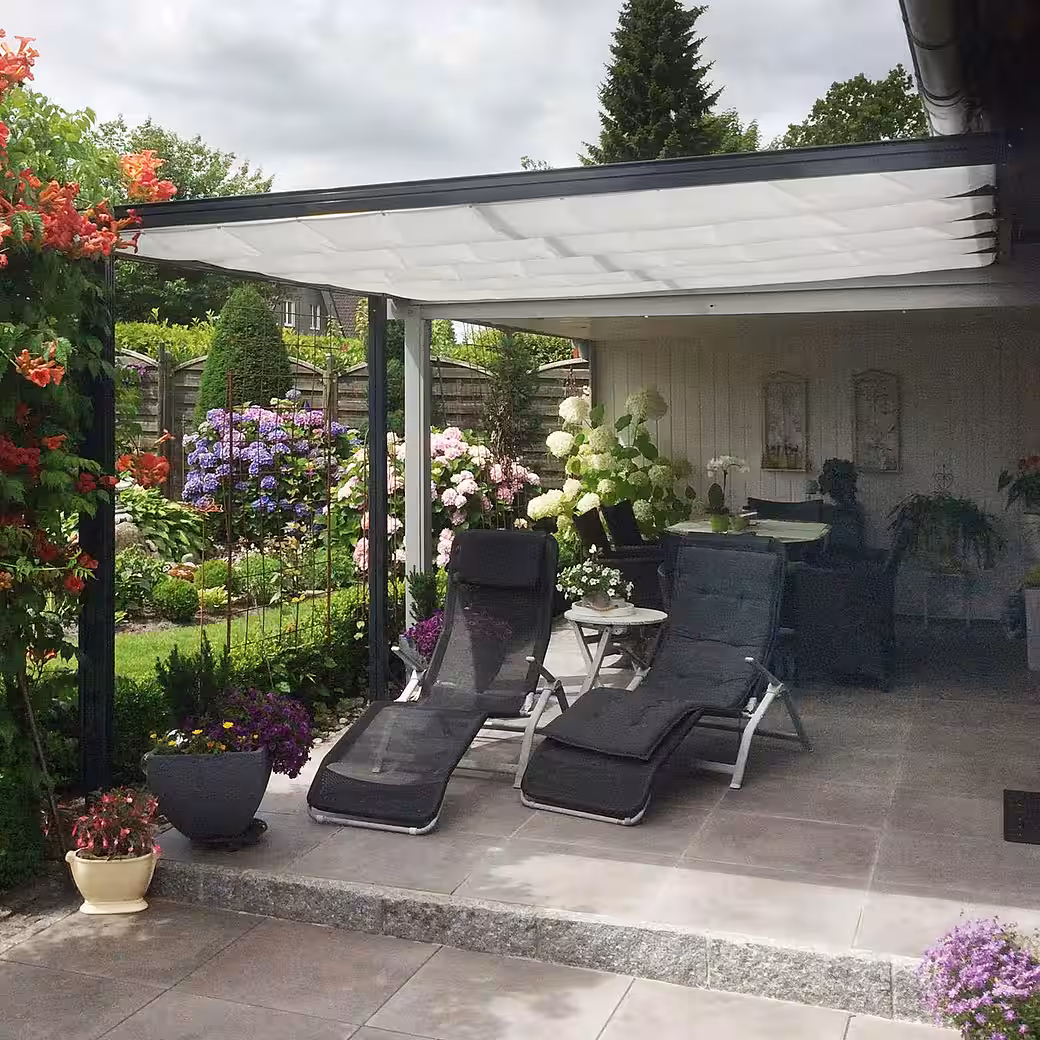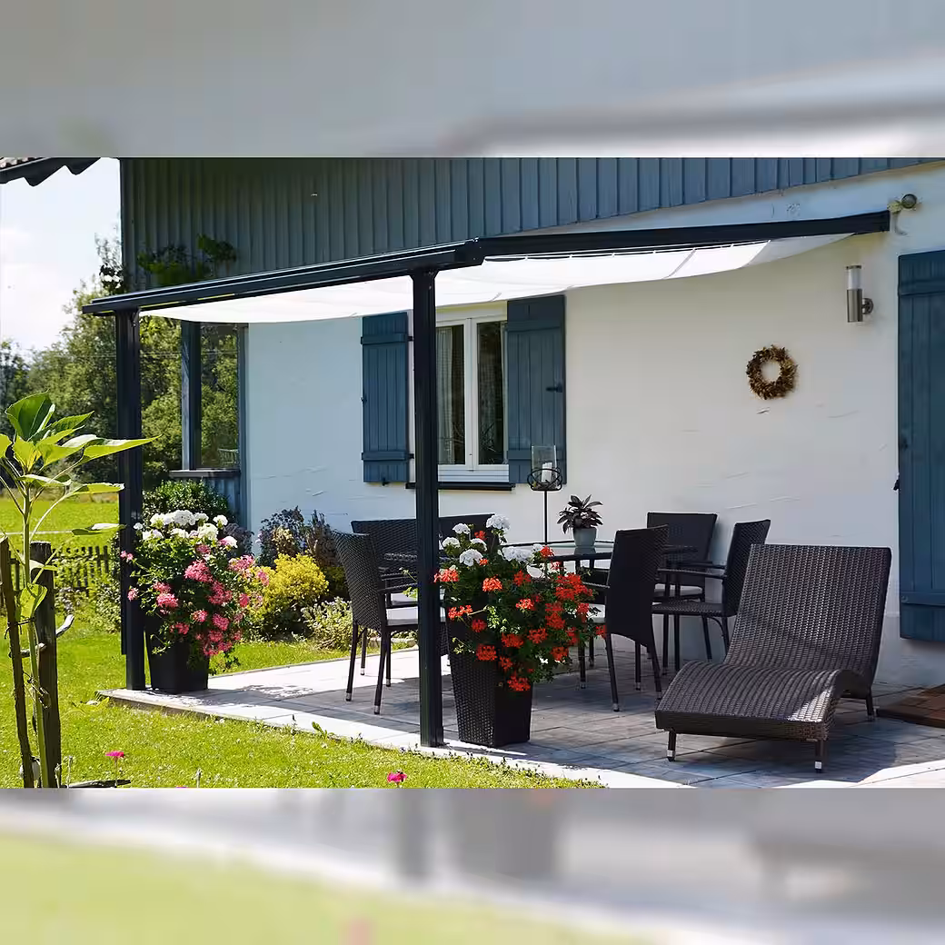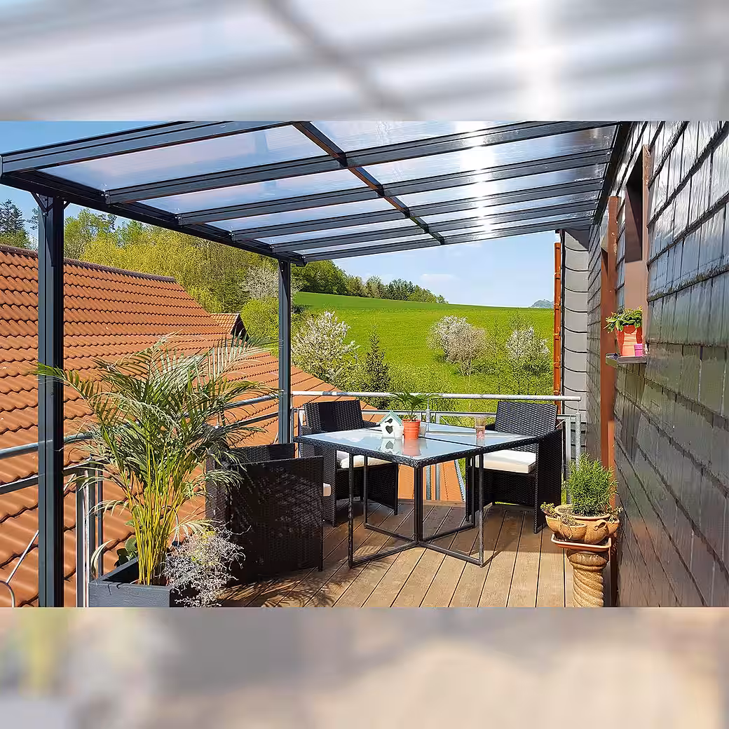 The “Trend” patio roof is an attractive, durable, and popular addition to your home. The low-maintenance construction, made of high-strength aluminum profiles, is structurally tested, and the load-bearing posts measure 80 x 64 mm. The roof is covered with shatterproof 6 mm thick polycarbonate twin-wall sheets. These “Longlife-Plus” quality sheets, with UV protection on both sides, maintain exceptionally high light transmission even after years of exposure to the elements. Delivery includes a rain gutter with downpipe and all necessary mounting hardware. Available in four sizes and two colors (anthracite gray RAL 7016 and white RAL 9010). Size 1: Length: 312 cm Depth: 250 cm Size 2: Length: 312 cm Depth: 300 cm Size 3: Length: 435 cm Depth: 250 cm Size 4: Length: 435 cm Depth: 300 cm We offer a 20-year warranty on the aluminum profiles and a 10-year warranty on the twin-wall polycarbonate sheets.