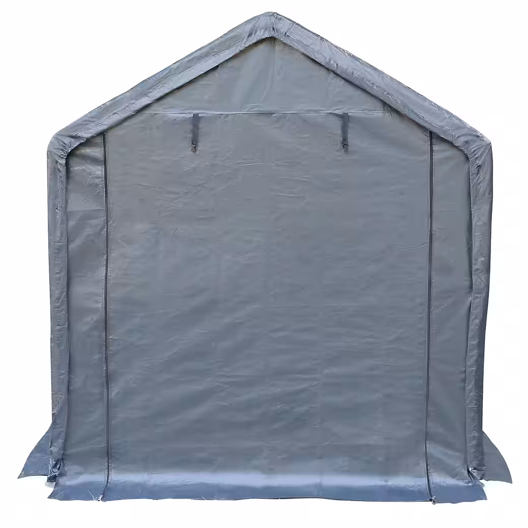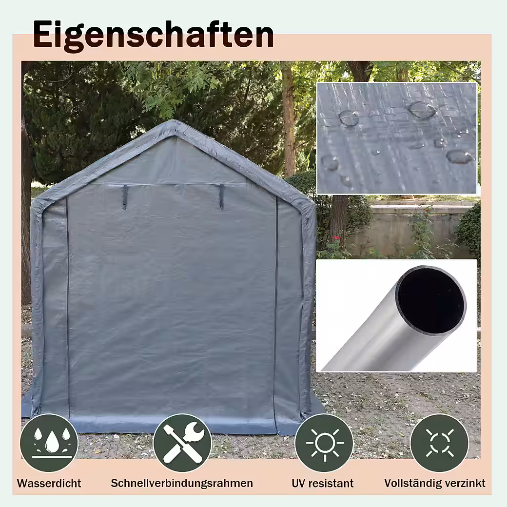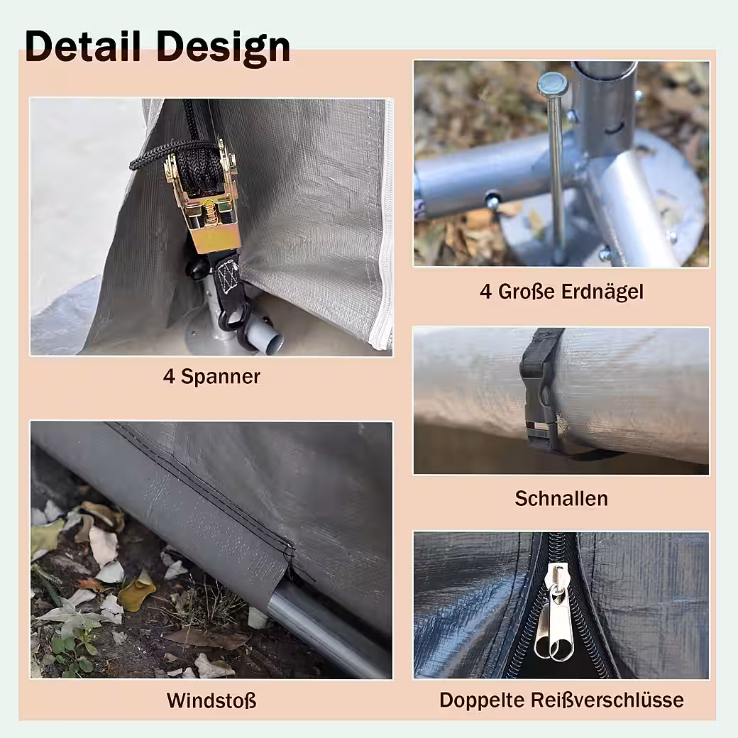 - Front gable wall with large entrance and robust zipper system. Wind deflectors at the bottom prevent drafts.