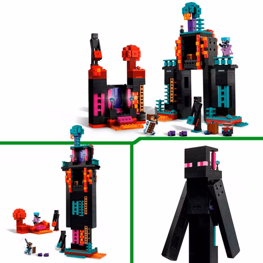 The main model is a tower shaped like the Enderman. Its head features a Nether portal, each shoulder has a balcony, and two rooms contain a crafting table, an enchanting table, and a chest for Ender Pearls. Ladders lead up its legs, and its articulated arms are fully movable. Outside, there are elements from the Warped Forest and Crimson Wood. The set also includes four minifigures (a Dimension Defender, a World Raider, and two Endermen) and two Ender Mites. Accessories include a Minecraft crossbow, a Netherite sword, and a Netherite shield. The Enderman Tower can be rebuilt into two fortresses in different colors to recreate classic PvP action. The LEGO Builder app offers additional building fun.