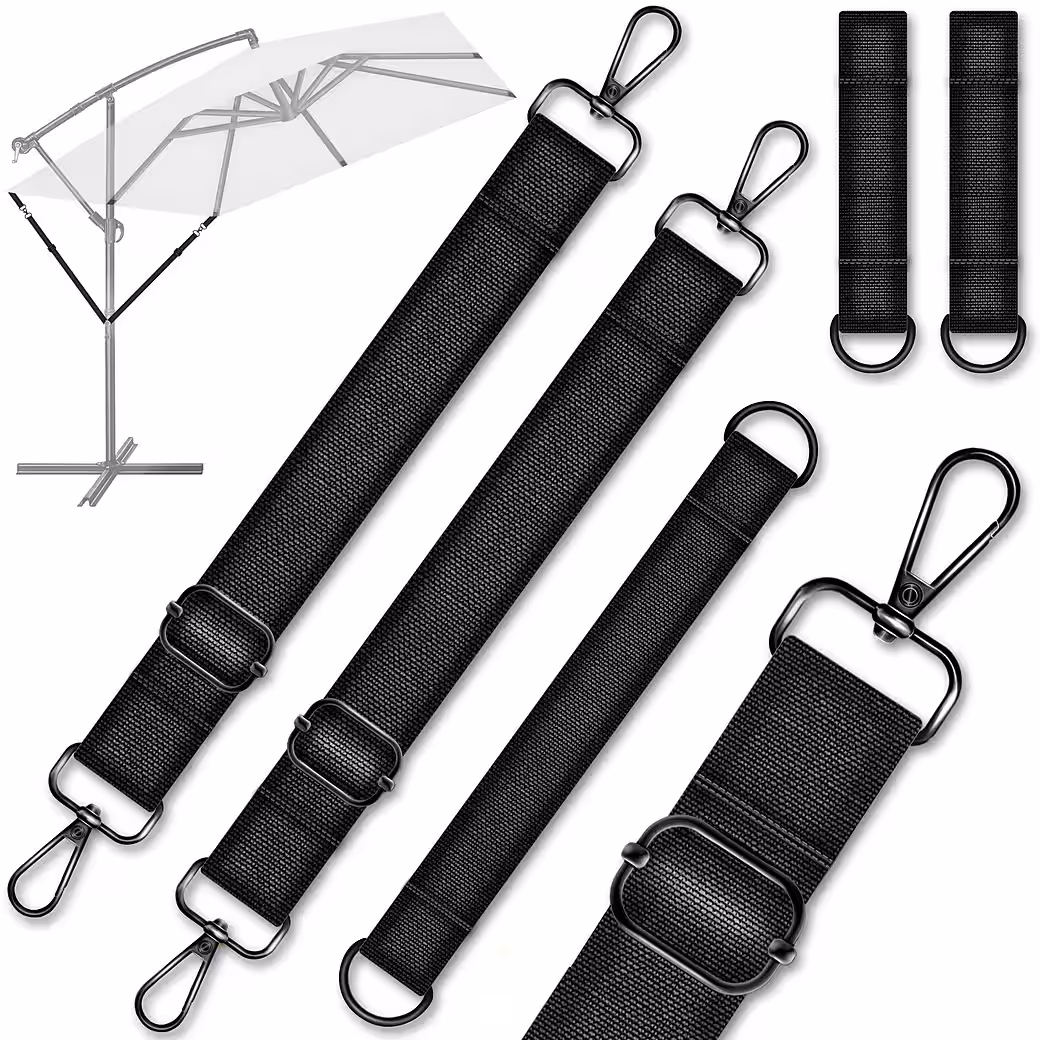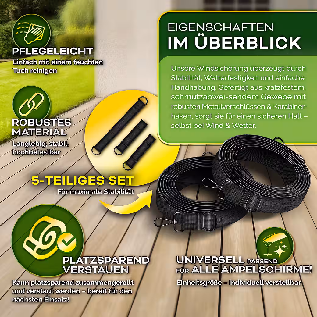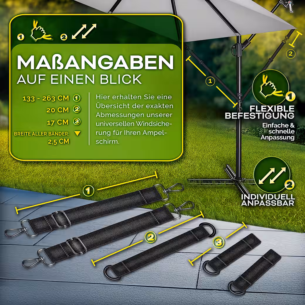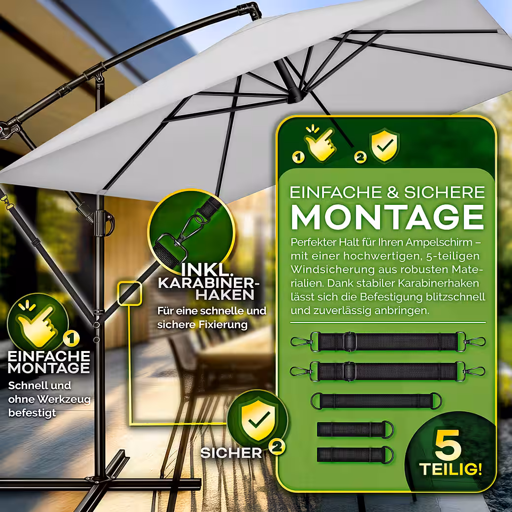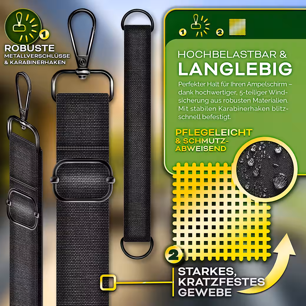Enjoy carefree hours in the garden, on the patio, or on the balcony without worrying about your parasol. The tillvex® wind protection system provides a stable and reliable attachment to keep your parasol secure, even in strong winds. Thanks to the 5-piece set with high-quality carabiners, assembly is incredibly easy and requires no tools. The adjustable securing straps are universally compatible with parasols with a diameter of 3.00 m to 4.00 m. Maximum stability for greater safety!