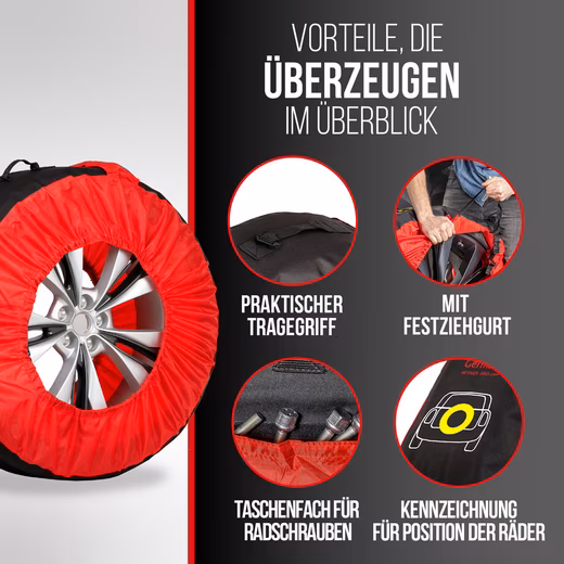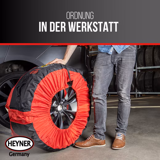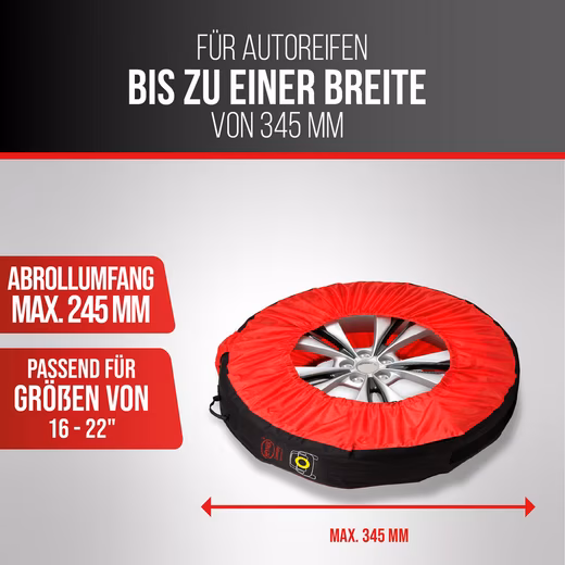 The HEYNER® SUV WheelStar PRO is a high-quality tire bag, specially designed for spare wheels with a diameter of 16 to 22 inches and a tire width of up to 345 mm. Thanks to its sturdy carrying handle, transporting your tires is particularly convenient and safe. The bag is suitable for both storage and transport, and its practical markings on the surface allow for easy wheel identification. Made of durable 600D Oxford nylon, the tire bag ensures a long service life and optimal protection against dirt and damage. The maximum rolling circumference is 245 cm, so even larger SUV tires fit easily. The HEYNER® SUV WheelStar PRO also features a separate pocket for storing wheel bolts, so you always have everything within easy reach. The elegant black and red color scheme gives the bag a modern and professional look. Rely on quality and functionality – with the HEYNER® SUV WheelStar PRO tire bag, your tires are optimally protected and easy to handle.