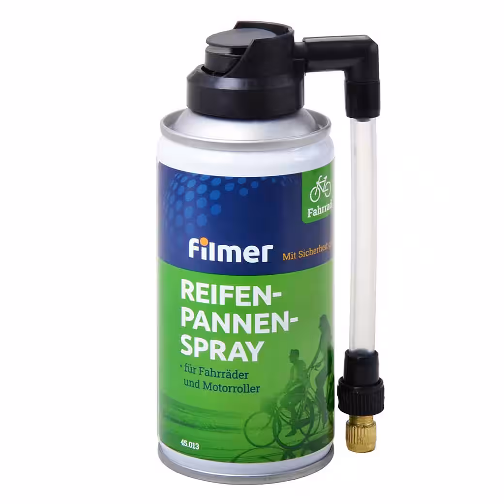 Fimer Tire Repair Spray. This offer is for a 150 ml can of tire repair spray for bicycles, scooters, and motorcycles. This spray allows for a quick, temporary repair of your tire. A sealant seals the repaired area and inflates the tire. Torn or blown tires, or tires with extensive damage, cannot be repaired with this product. This product only provides a temporary repair and is not suitable for permanent tire repair. Application: Eliminate the cause of the puncture. Rotate the tire so that the valve is at the top. Screw on the tire’s valve cap. Screw the included valve onto the screw connection of the tire repair spray. Hold the spray can upright. Activate the spray by pressing down on the spray nozzle. As soon as the tire pressure increases, stop spraying and screw the tire’s valve cap back on. Immediately after using the spray, rotate the tire to ensure the sealant is evenly distributed. Additional air may need to be added. Check the tire pressure after approximately 10 km. Then, take your vehicle to the nearest garage or specialist workshop to have the tires changed.