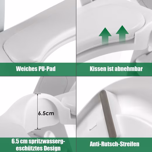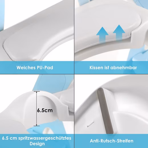 - The scientific back design protects the spine, the soft PU padding protects the child’s skin, the splash guard prevents urine spillage.