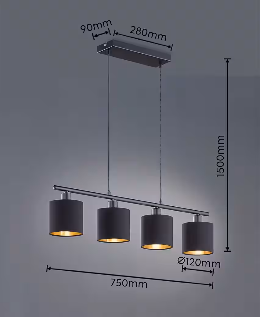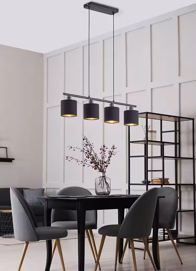 The TOMMY pendant light creates a warm and inviting atmosphere, thanks to its fabric shades that enhance comfort and conjure a cozy ambiance. At the same time, its clean lines lend it a modern and minimalist style that is versatile and easy to combine with other fixtures. Measuring 75 x 12 cm, this four-light pendant is ideally suited for placement above a dining table. The swivel heads can be precisely adjusted to highlight specific areas. The pendant length can be adjusted up to a height of 150 cm during installation. The light fixture is crafted from matte black metal and complemented by four fabric shades in a contemporary black and gold color combination. This combination creates stylish lighting accents and lends living and dining areas an exceptional sense of well-being. For modern and reliable illumination, we recommend using an LED bulb. It offers high-quality light, is versatile, and provides even illumination. Its long lifespan and low heat generation make it the ideal choice for a wide range of applications.