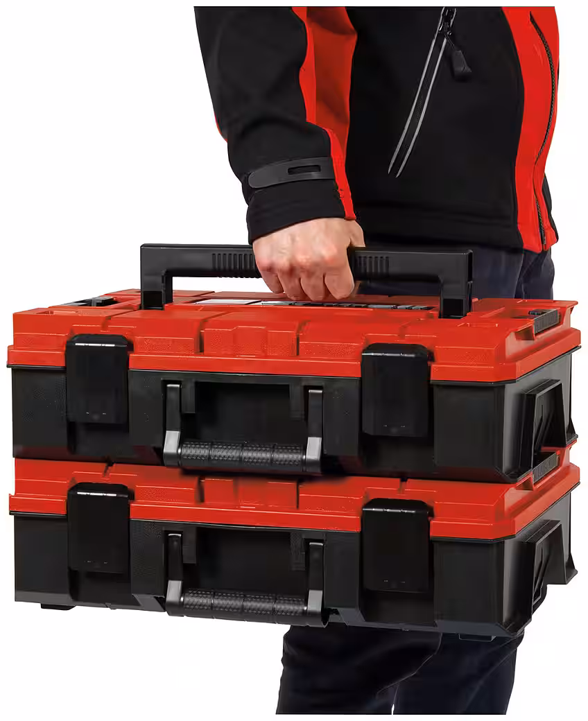 The Einhell E-Case SF case ensures easy storage and convenient transport of power tools and accessories. Part of the flexibly combinable E-Case case system, the E-Case SF is ideal for storing and transporting tools and accessories. The case measures 13 cm high, 44 cm long, and 33 cm wide. Thanks to its maximum load capacity of 25 kg, this high-quality system case offers maximum flexibility and can accommodate various tools, including attachments and accessories such as screws or drill bits. A practical locking system for connecting stacked cases ensures organized, secure storage and easy transport. The special design allows the cases to be opened even when stacked. Made of polypropylene, the case is splash-proof, heat-resistant, and impact-resistant. Two foldable, ergonomic handles provide comfortable carrying. An integrated mechanism allows the case to be secured with a standard padlock to prevent theft.