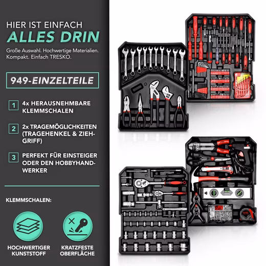 Suitable for the areas of application: hobby & do-it-yourself, building furniture, repairs to the house and renovations, electronics, bathroom & toilet, heating, working on a car or motorcycle.