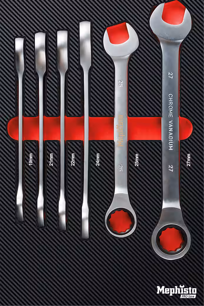 - 15 x Fine-toothed ratcheting combination wrenches 6 / 8 / 10 / 11 / 12 / 13 / 14 / 15 / 17 / 19 / 21 / 22 / 24 / 25 / 27 mm