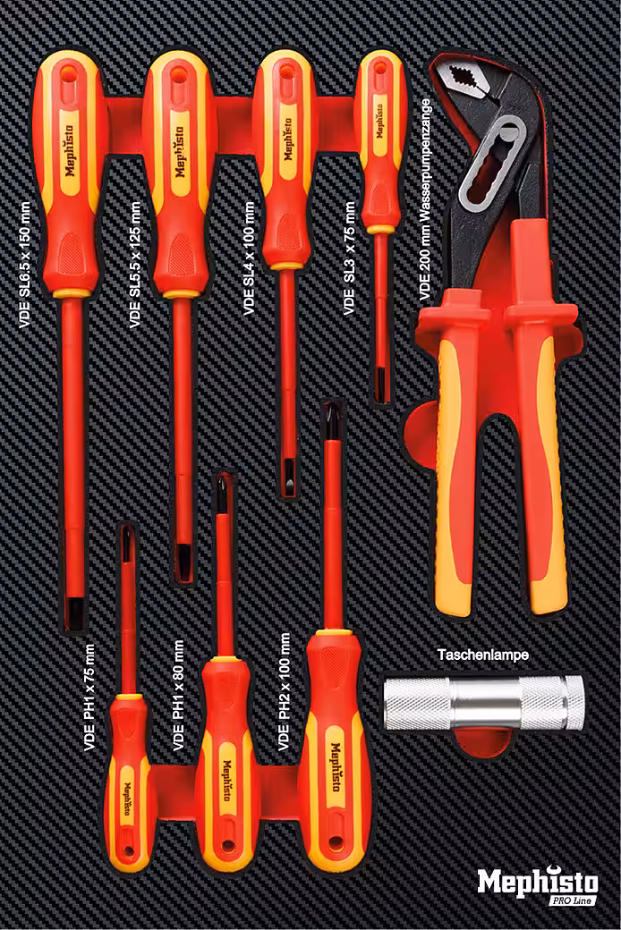 - 7 x VDE screwdrivers: PH0*75 mm / PH1*80 mm / PH2*100 mm / SL3*75 mm / SL4*100 mm / SL5.5*125 mm / SL6.5*150 mm