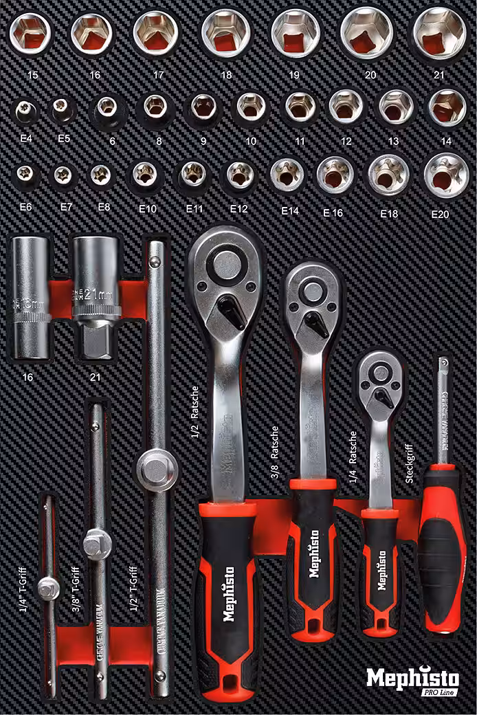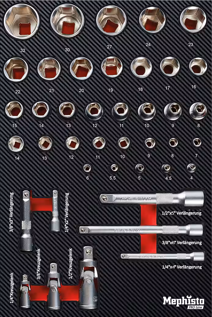 - Tool made of chrome vanadium steel / Inlays made of robust and flexible, deformation-resistant foam material with a liquid-repellent, dirt-repellent coating