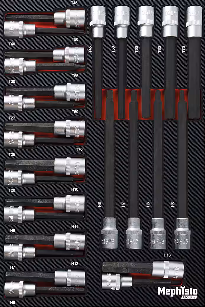 - 24 x 8 mm Bits: SL8 / SL10 / SL12 / PH3 / PH4 / PZ3 / PZ4 / T40 / T45 / T50 / T55 / T60 / T70 / H7 / H8 / H10 / H12 / H14 / TT40 / TT45 / TT50 / TT55 / TT60 / TT70