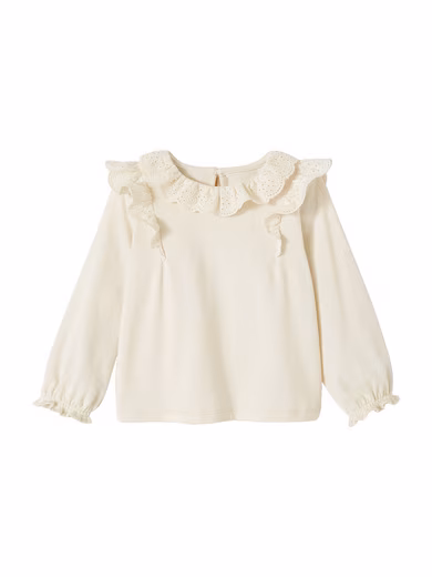 • Shirt: Long sleeves. Round neckline, festive flounced collar with eyelet embroidery. Ruffles with eyelet embroidery at the shoulder. Teardrop neckline with button at the back of the neck.