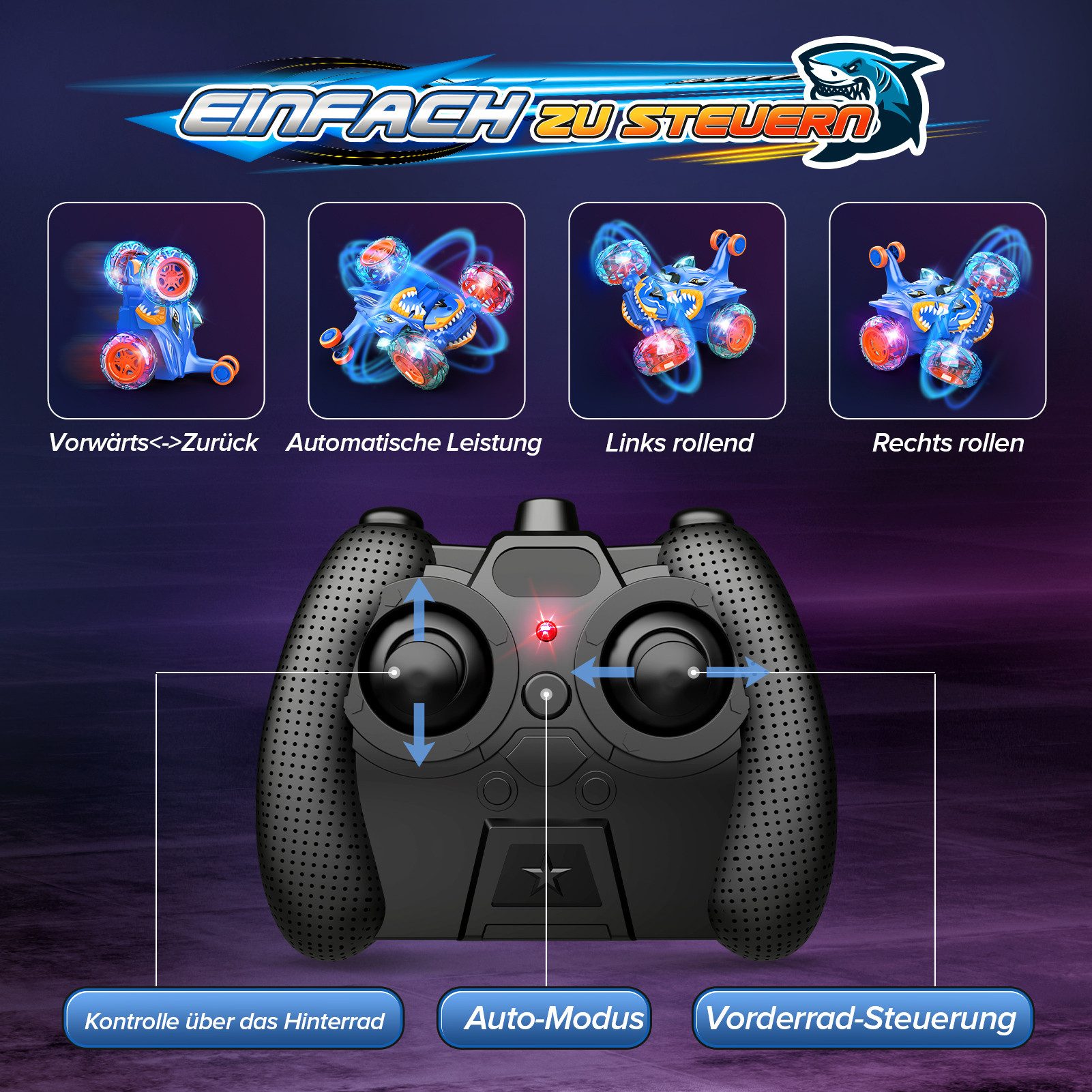 360° Rotating Shark Remote Control Car: This monster truck features a 360-degree rotating front axle, allowing it to easily perform amazing, fancy 360° spins. The wheels and body of the remote control car emit cool lights, completing a light show at night.
