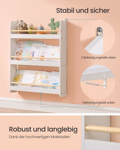 - Safety is paramount: The children’s shelf is equipped with 3 mounting parts that allow for secure attachment to the wall and prevent it from falling.