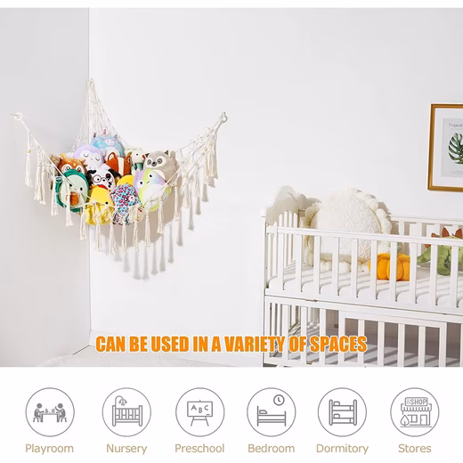 - This tassel-decorated hanging net for stuffed animals adds a boho style to your room. A fun way to store a child’s toy collection.