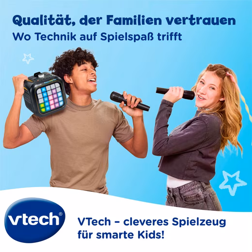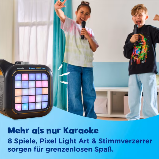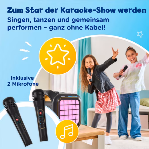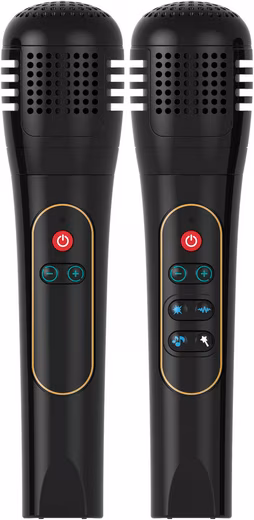 - The microphones each have 4 sound effect buttons for cool voice effects such as vibrato, chorus or fun pitch effects (high, low, robot) and duet.