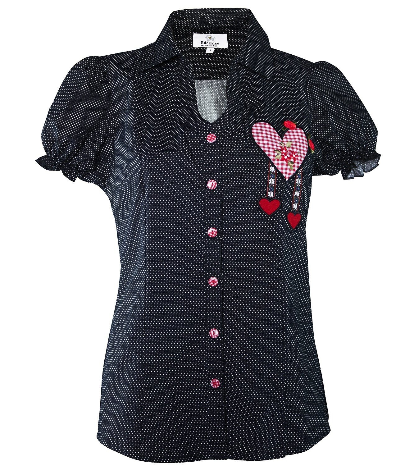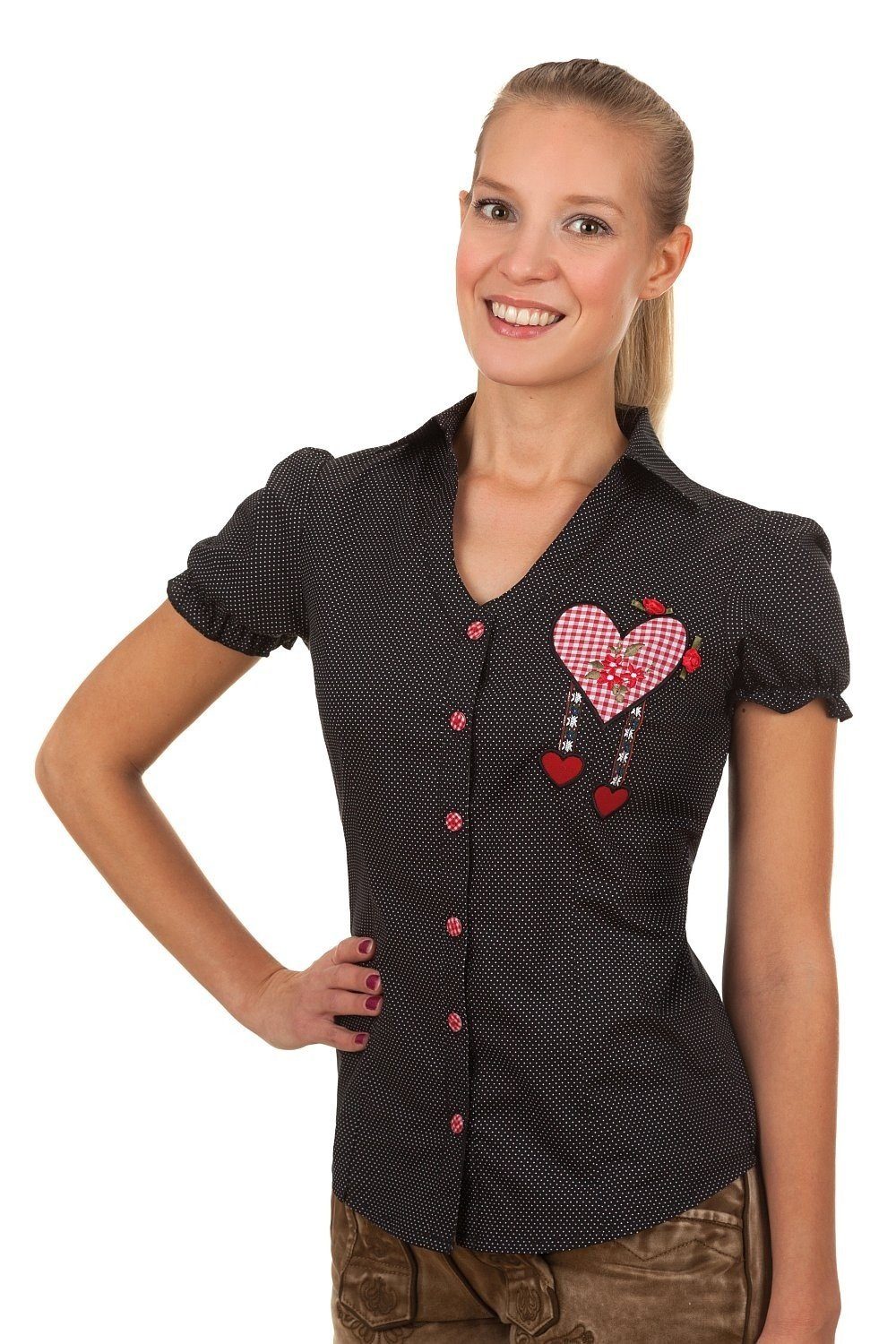 Adorable, fitted blouse with pretty gathered sleeves. The black fabric of the blouse is patterned with white dots, and the left side features a heart appliqué and two small roses.