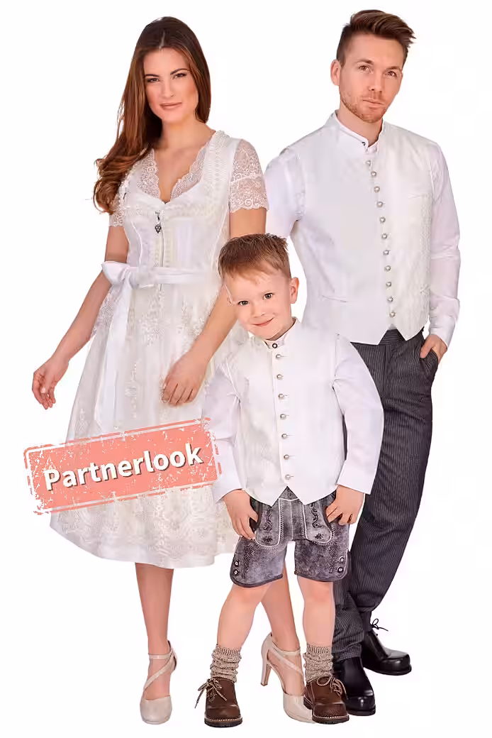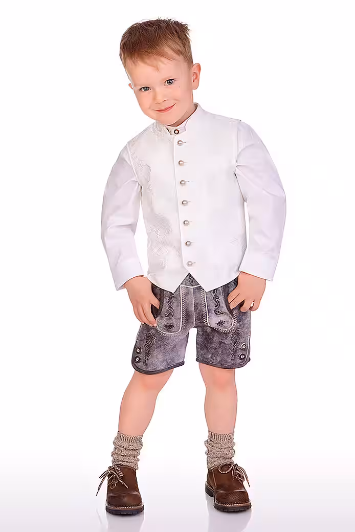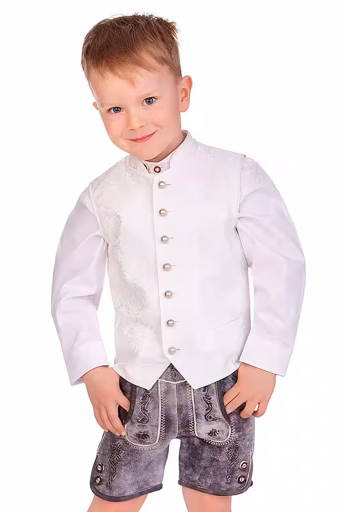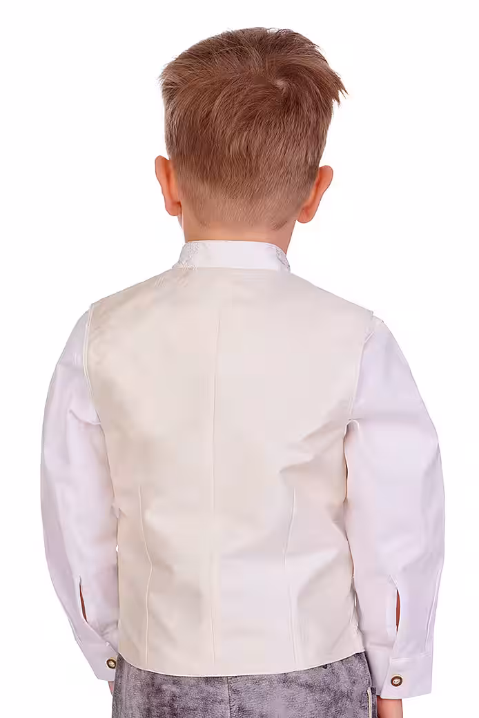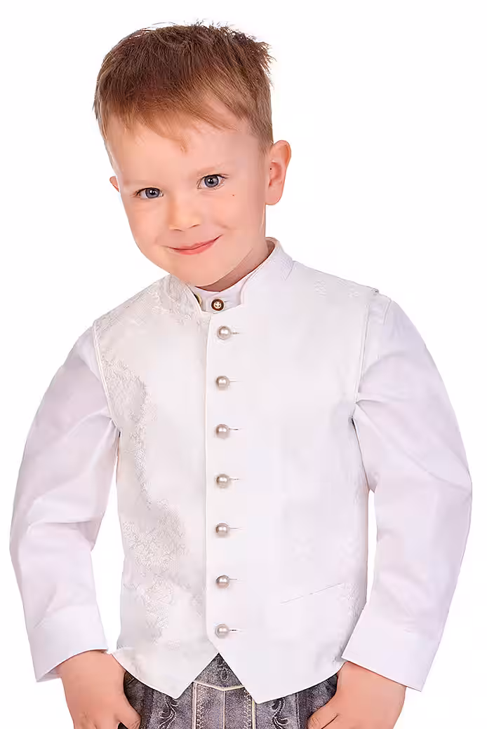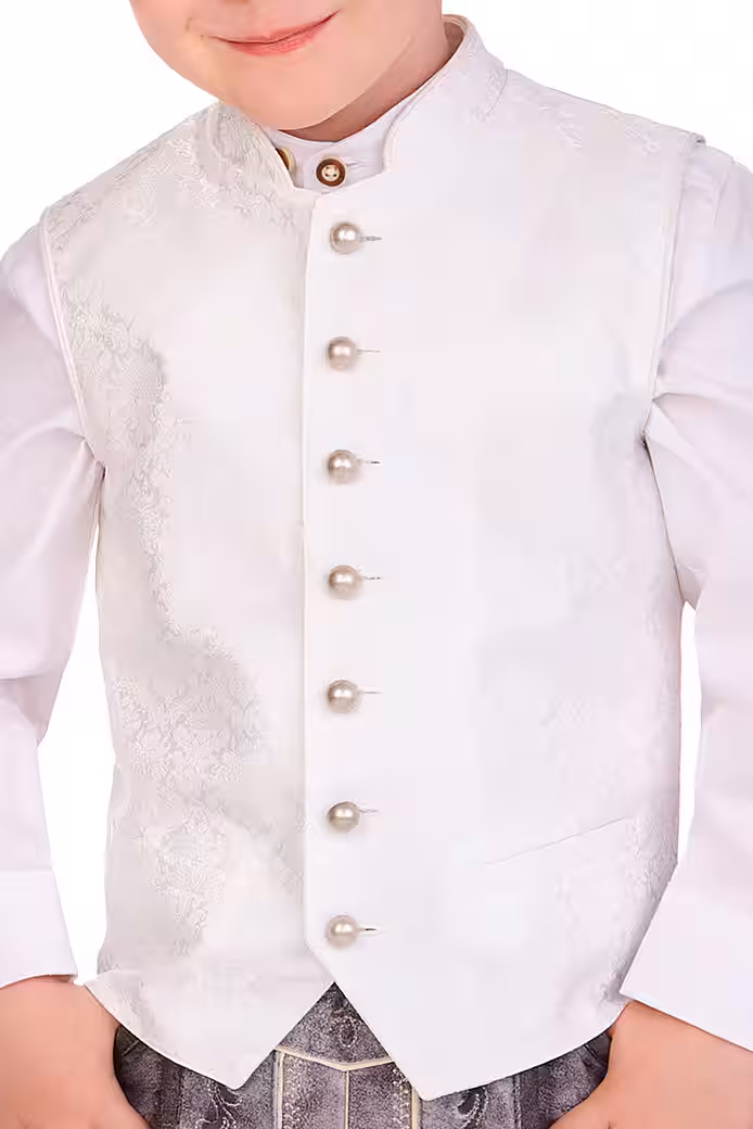The fantastic children’s traditional costume vest Elias Kids, an elegant treat for special moments, is made of finely shimmering jacquard with a stylish, floral ornamental weaving pattern at the front and has a beautiful, slightly shiny vest back made of cream taffeta with a subtle structure. The elegant stand-up collar and arm necklines are elegantly worn. At the front there is a breast pocket and two piping-shaped pockets as a decorative element. The button placket of the exquisite, cleanly lined boys’ vest is equipped with traditional ball buttons in old silver. This wonderful creation comes from the MarJo brand and is a lovely companion for the parents’ baptism, communion, confirmation or wedding. You can find matching wedding dirndls and men’s vests in the Alpenwahnsinn online shop.