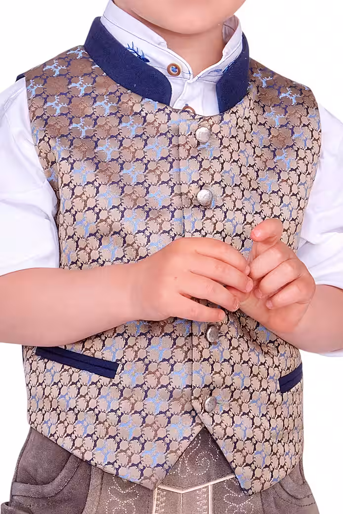 The pretty traditional Hennes children’s vest from Isar-Trachten consists of a wonderfully shimmering jacquard on the front and has a sophisticated weaving pattern of jumping deer in brown, navy and light blue on beige. Depending on the incidence of light, the deer or the substrate appear brighter or darker, the classic stand-up collar and the double piping of the decorative intervention bags are made in the Loden style in Marine. The button placket is adorned with core metal eyelet buttons in old silver with an antique look. The festive traditional vest for boys, neatly lined with satin fabric, is made perfect by the wonderfully iridescent vest back made of taffeta in marine. Please note the size surcharges from size 110.