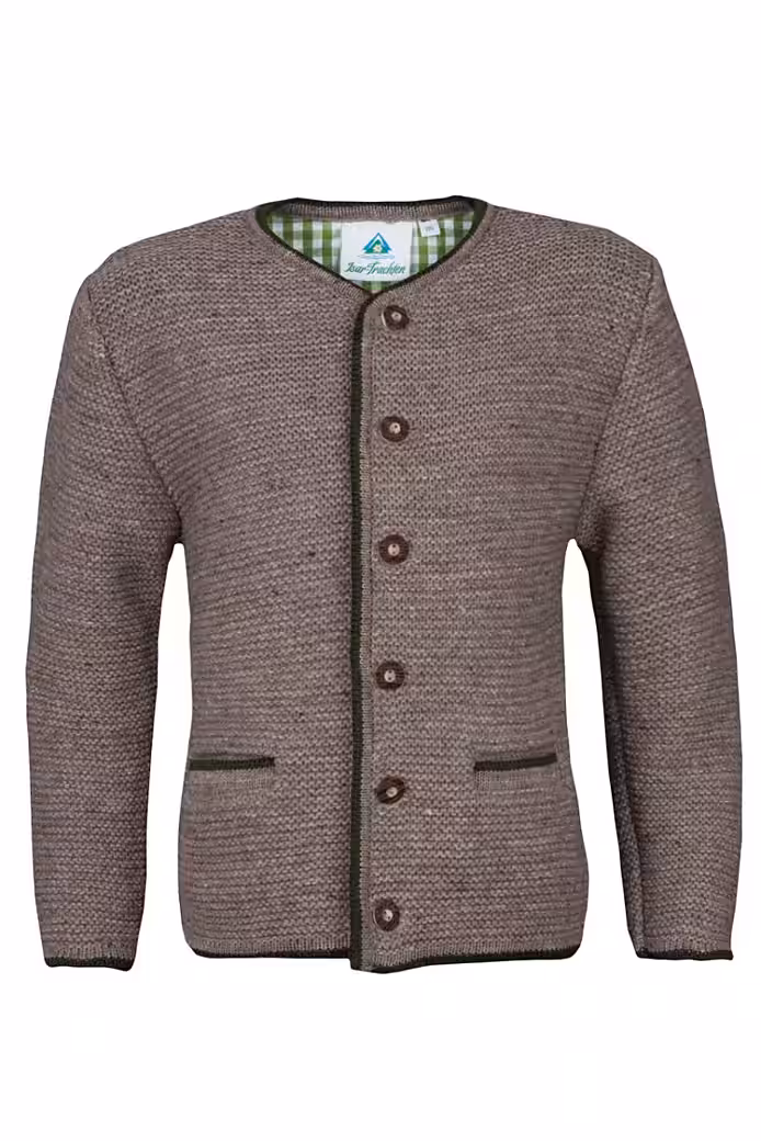 The robust traditional cardigan “Lewin” in the color Berber for children is made with soft wool in a timeless, finely melange left-knit look and has a button placket with rustic buttons in a stylized deer horn look. Both the round neckline, button and buttonhole strip as well as the hem and cuffs are emphasized with finely ribbed right-knit patterns and with outer edges in fir green. The wide right-hand knit piping of the mesh pockets is also accentuated in contrasting color on the edge. On the back there is a subtle dividing seam in the middle. The partial pocket lining and the comfortable lining in the neck area have a check pattern The children’s cardigan for Buam goes wonderfully with traditional jeans and lederhosen. Please note the size surcharges for sizes 98 and up.