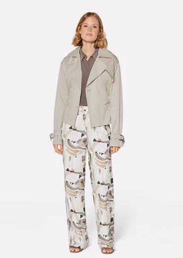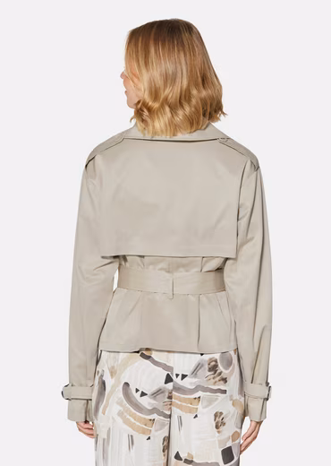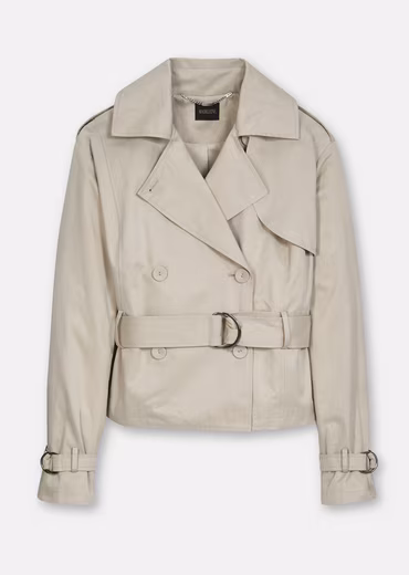 The trench style also works well as a short jacket, lending your look a sophisticated, sporty feel. Sophisticated yet casual, this jacket sets high fashion standards and completes your outfit with a stylish touch. The casual, straight, short cut is richly crafted and features a wide lapel collar, buttoned epaulettes, a front yoke, a back yoke, and adjustable cuffs. A tie belt is state-of-the-art and an absolute must. Covered buttons and an inside zip pocket complete the style. A chain hanger provides secure attachment to your coat.