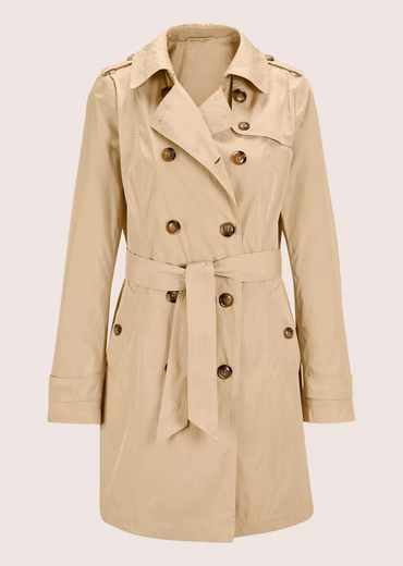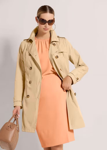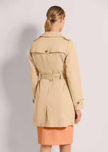 A short coat that shouldn’t be missing in any season! Its elegant, sporty look has been popular for decades and can be worn in a variety of ways. A stylish double-breasted piece is unmistakable with a lapel collar, button tabs on the shoulders and sleeves, and a signature tie belt. Front and back yokes are also a must – here with an additional button in the back. The side welt pockets offer practical storage space and can be closed with a button. Contrasting stitching completes the look perfectly.