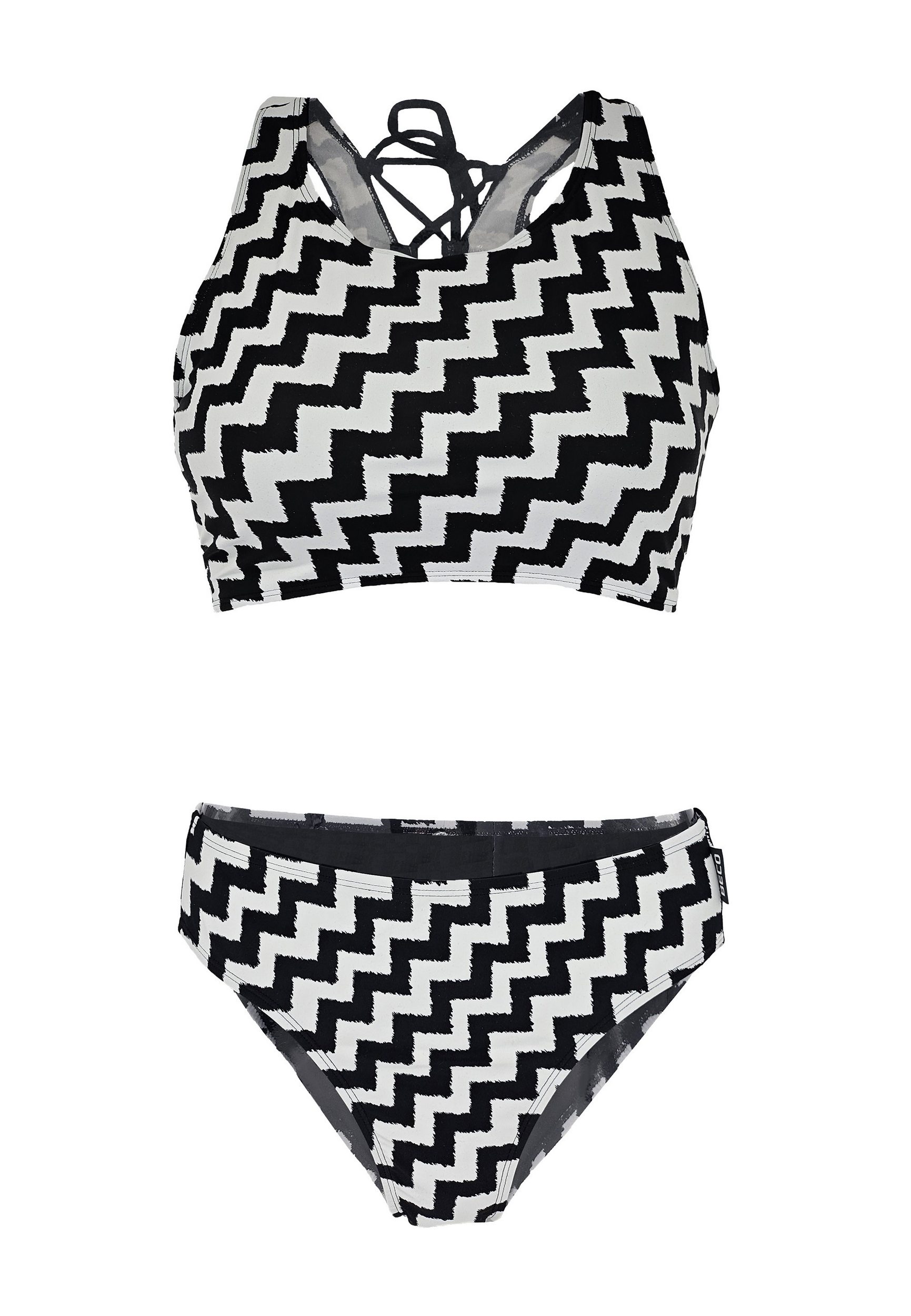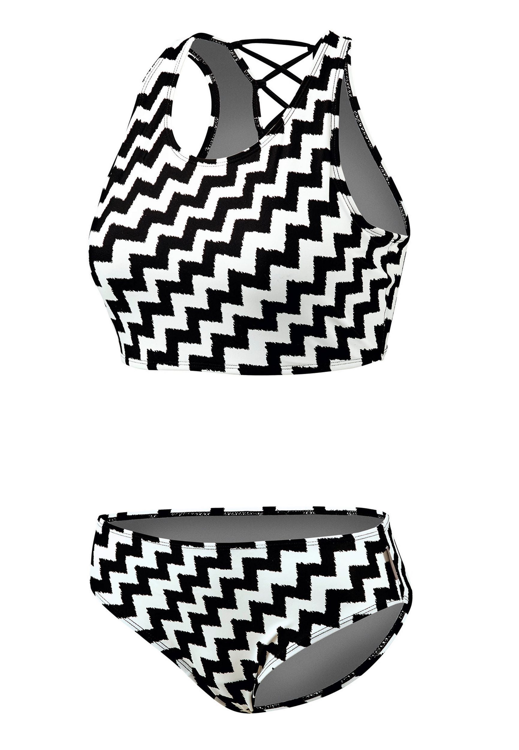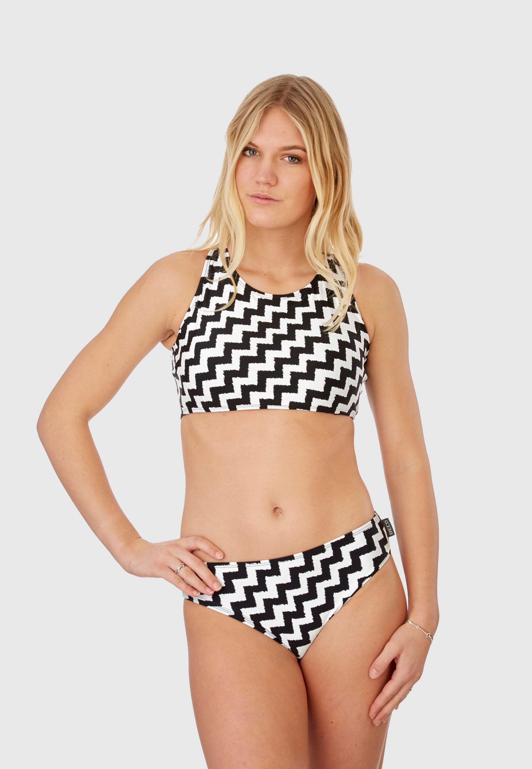 The BECO “Black & White” high-neck bikini is a stylish and functional choice for beach and water sports activities. This elegant ensemble impresses with its striking design and practical details that offer both fashion and comfort. The standout feature of this bikini is the unique criss-cross lacing in the back. This not only visually appealing but also functional lacing ensures an exceptionally secure hold. A chic black and white zigzag pattern, reminiscent of classic houndstooth, is not only fashionable and timeless but also offers a visual contrast that flatters the figure. Fully lined and removable soft pads offer a custom fit as well as additional comfort and privacy. The bikini bottoms are deliberately cut slightly wider. This design decision not only serves comfort but also conceals a tummy, making the bikini a flattering choice for various body types. The slight figure-shaping effect of the bottoms ensures a confident wearing experience. The high-quality materials and meticulous craftsmanship guarantee durability and resistance, even with frequent wear and contact with salt or chlorinated water.