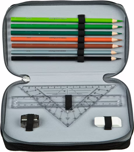 All your pens and pencils are easily accessible in the Scooli Tripledecker pencil case with its Star Wars design. The case offers ample space in three compartments for pens, a ruler, or a pencil sharpener. Pencil loops keep everything organized. The pencil case comes filled with 21 high-quality triangular colored pencils from Eberhard Faber, 2 triangular pencils from Eberhard Faber, an eraser, a 17 cm ruler, a pencil sharpener, two alphabet stencils, a set square, and a Star Wars-themed timetable. The timetable is located in a clear window pocket and can be easily replaced. The Eberhard Faber pencils are made from 52% recycled material.