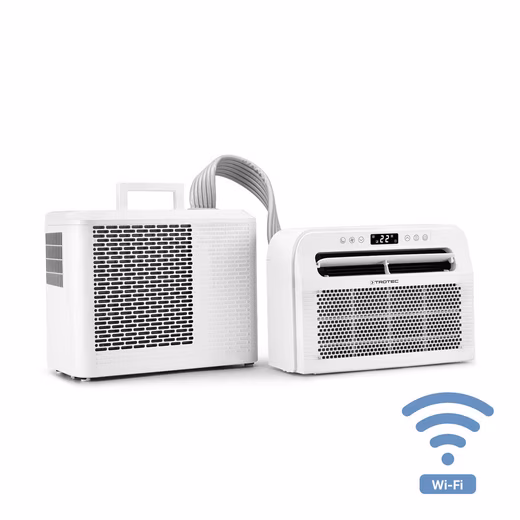 The PAC-C 1500 S WiFi is an air conditioner specifically designed for use in caravans and motorhomes. With integrated cooling, dehumidifying, and ventilation functions, it ensures a comfortable indoor climate while traveling – reliably, efficiently, and easily. The combination of indoor and outdoor units is particularly space-saving and easy to install. Three operating modes: In cooling mode, it efficiently lowers the room temperature to the desired level, with the compressor automatically adjusting its output. This keeps the room temperature constant and comfortable. In dehumidifying mode, moisture is removed from the air, significantly improving the indoor climate, especially in high humidity. The ventilation function allows for pure air circulation without changing the temperature. Operation is conveniently controlled via the control panel on the indoor unit. Additionally, the unit is WiFi-enabled and can be easily controlled via smartphone using the Trotec Assistant app. Specially developed for motorhomes – safe and flexible installation: The air conditioner consists of an indoor and an outdoor unit that are permanently connected. Both units are hung together in a window of the vehicle. The outdoor unit is located outside the vehicle, while the indoor unit is installed inside. The integrated connecting line must not be disconnected or damaged. The condensate pump in the indoor unit automatically transports any condensate to the outdoor unit, where it evaporates on the heat exchanger. Manual draining is only necessary in case of a malfunction. Easy to use – with timer, night mode, and swing function. Thanks to its well-designed controls, the PAC-C 1500 S is intuitive to operate. The timer allows for timed on/off switching in 1-hour increments up to 24 hours.