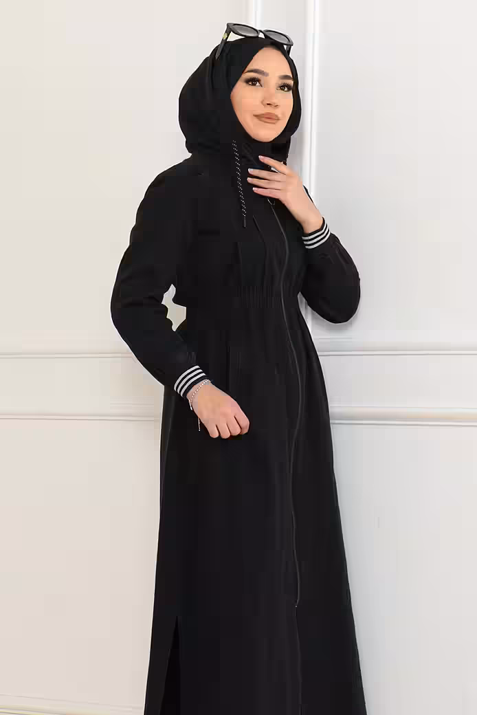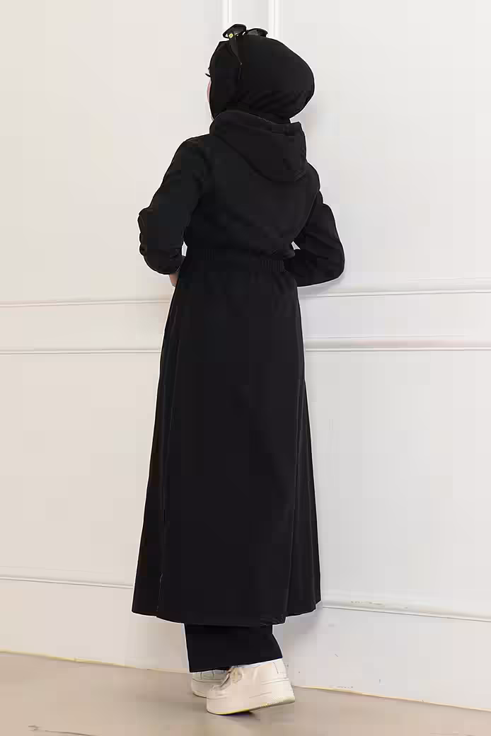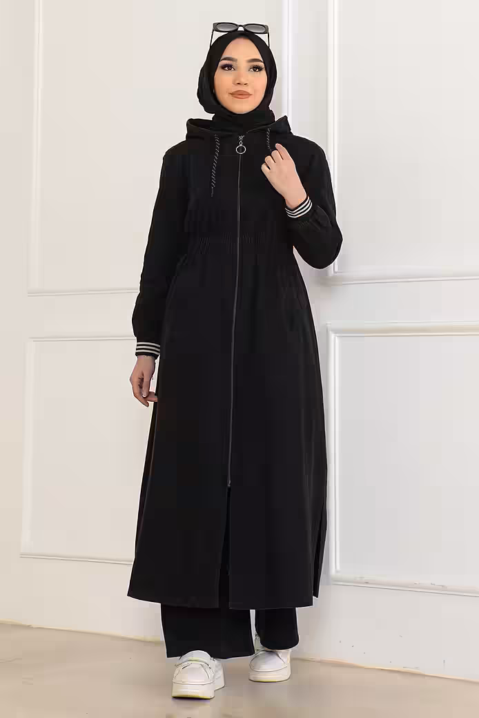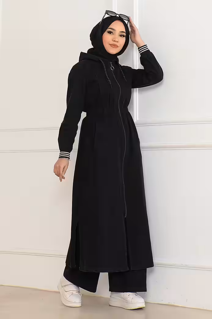 The MODAMİHRAM Dark Blue Elastic Hooded Denim Tunic Dress Set impresses with its combination of comfort and style. The set includes a dark blue tunic dress and matching elastic hooded denim jacket, creating a modern and sporty look. The stretchy material ensures a comfortable fit and freedom of movement, while the hood adds a casual touch to the outfit. Perfect for everyday wear and leisure activities.