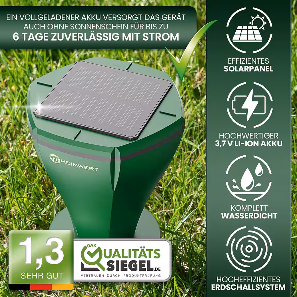- THANKS TO SOLAR POWER, NO FURTHER COSTS: The Heimwert Solar Mole Repellent is charged via a highly efficient solar panel. This allows you to bridge even cloudy days.