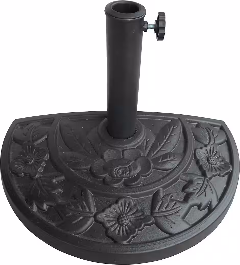 The parasol base for wall-mounted parasols is a high-quality accessory specifically designed for securing wall-mounted parasols. Made of black powder-coated steel, the base features an attractive floral pattern for an elegant look. Additionally, the stone powder coating provides extra weight, ensuring stability in all weather conditions. This makes it an ideal choice for use on your patio, balcony, or in your garden.