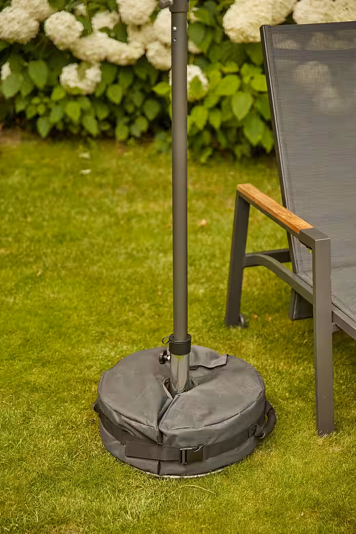 Universal weight bag, Ø 45 cm, made of 600D polyester in anthracite, to be filled with sand (sand not included), weighs approx. 40 kg when filled, attaches to the parasol stand with Velcro and buckle.
