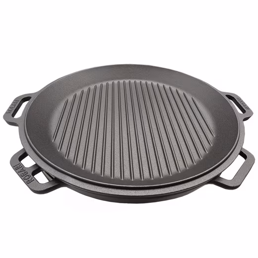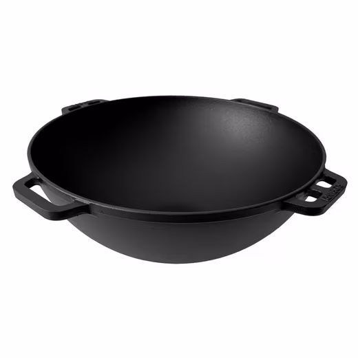 An uchak with chimney, a shovel, and a 15-liter cast iron kazan with a grill pan lid.
