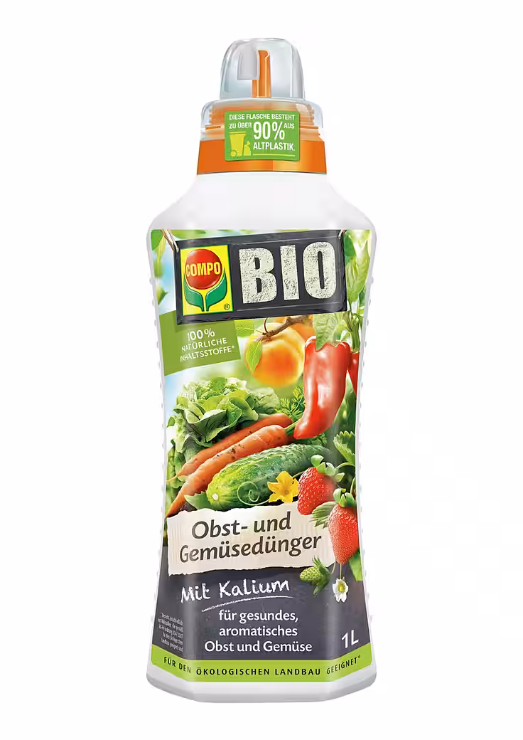 All COMPO liquid fertilizer bottles consist of over 90 percent recycled plastic from the yellow bag or yellow bin. The manufacturing process uses post-consumer materials, i.e., plastic waste generated by private or commercial end users. This is unique in the fertilizer industry. As a result, CO2 emissions are significantly reduced and the environmental footprint is improved.