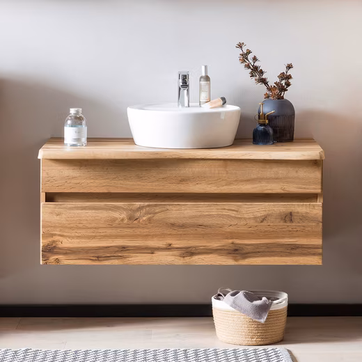 Quality furniture made in Germany – the VIDAGO-03 bathroom furniture series impresses with its modern design and high-quality workmanship. A particular highlight is the intricately crafted vanity top with its live-edge look, which creates a wonderful ambiance. Door hinges can be mounted on the left or right, giving you even more options when designing your bathroom. Doors and drawers also feature a soft-close mechanism. The bathroom series is available in Wotan oak and graphite finishes. You can combine many individual pieces to create your own personal bathroom set. You also have the option of choosing one of our suggested combinations.