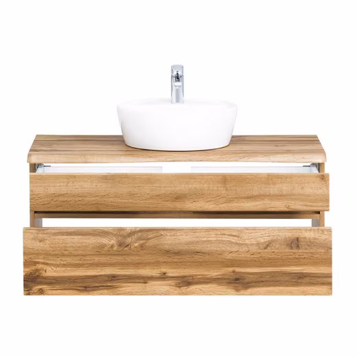 101 cm vanity unit including VIDAGO-03 ceramic countertop basin in Wotan oak finish with vanity top in live edge look