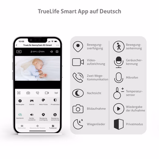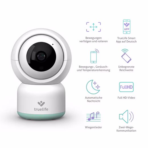 Rest assured, your baby is safe and sound. As a discreet guardian for babies and older children, the TrueLife NannyCam R3 Smart baby monitor ensures you can keep an eye on your little one, wherever you are. You can easily pair the baby monitor with your mobile phone and the TrueLife Smart App , which is available in German . Not only can you monitor your baby’s activities, but you can also set up various smart features . Everything is simple, quick, and secure . The rotating baby monitor continuously monitors the area where your baby is located and delivers images in full HD quality . It can detect movement, sounds, and temperatures , alerting you at the right time if something is wrong. Lullabies help lull your baby to sleep and create a pleasant environment.