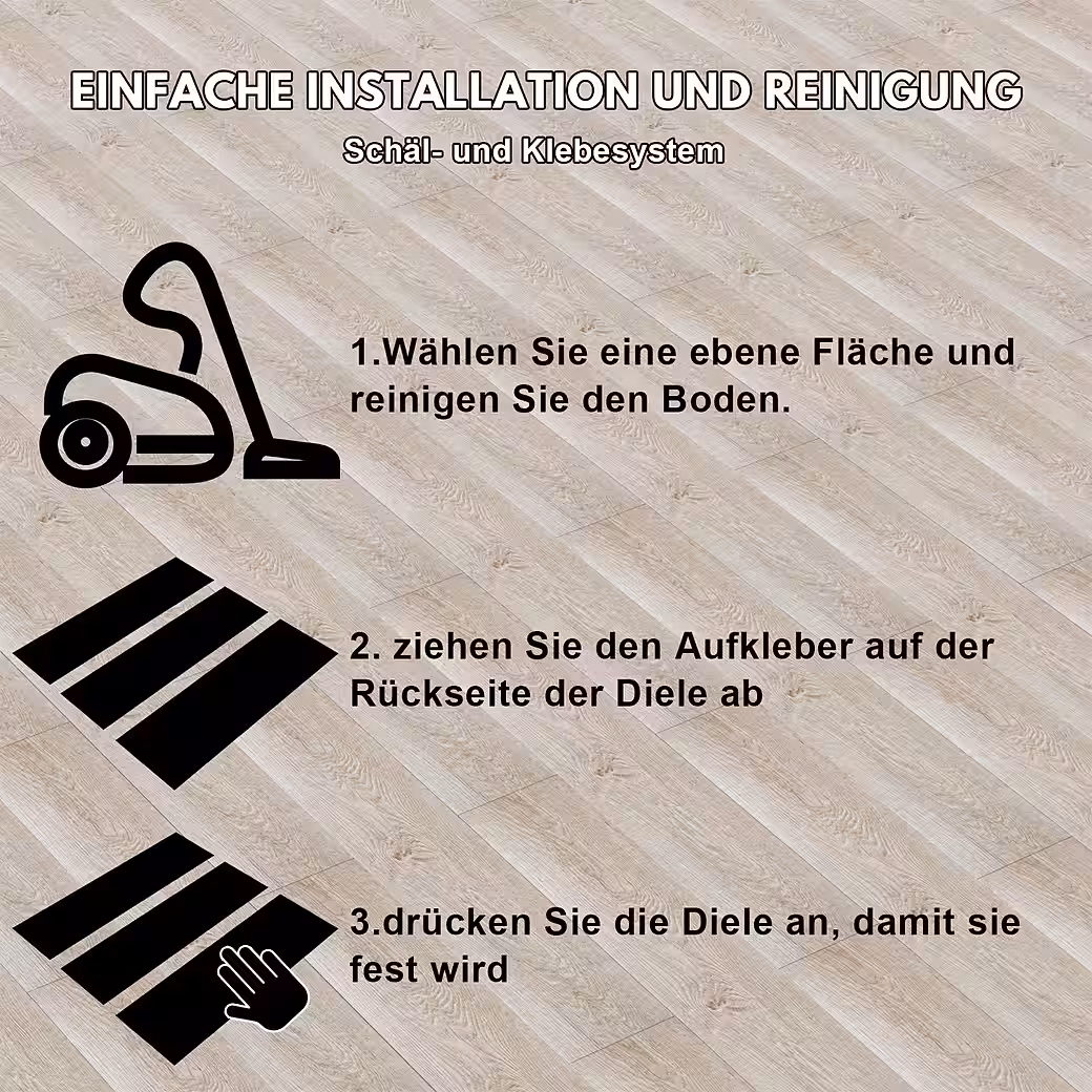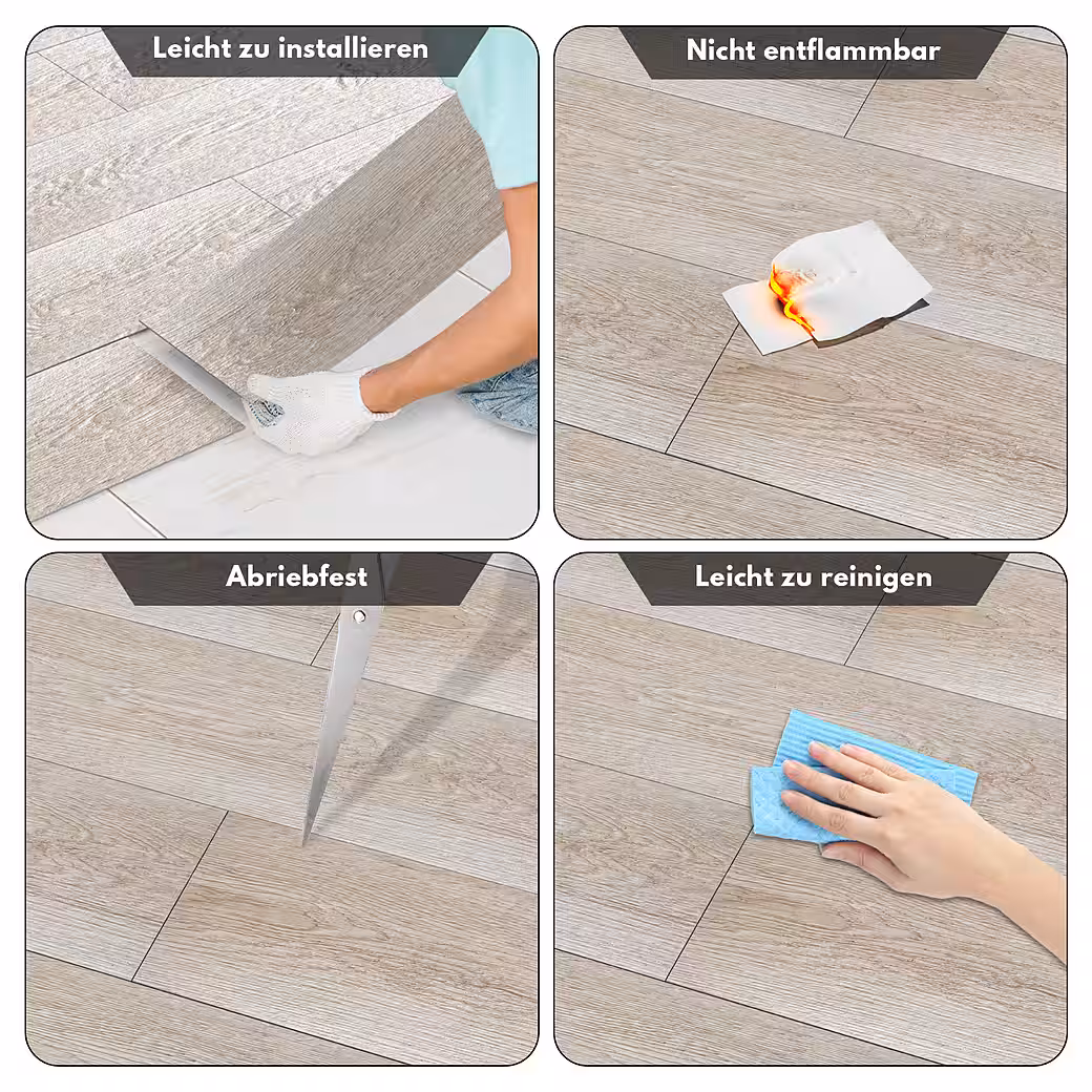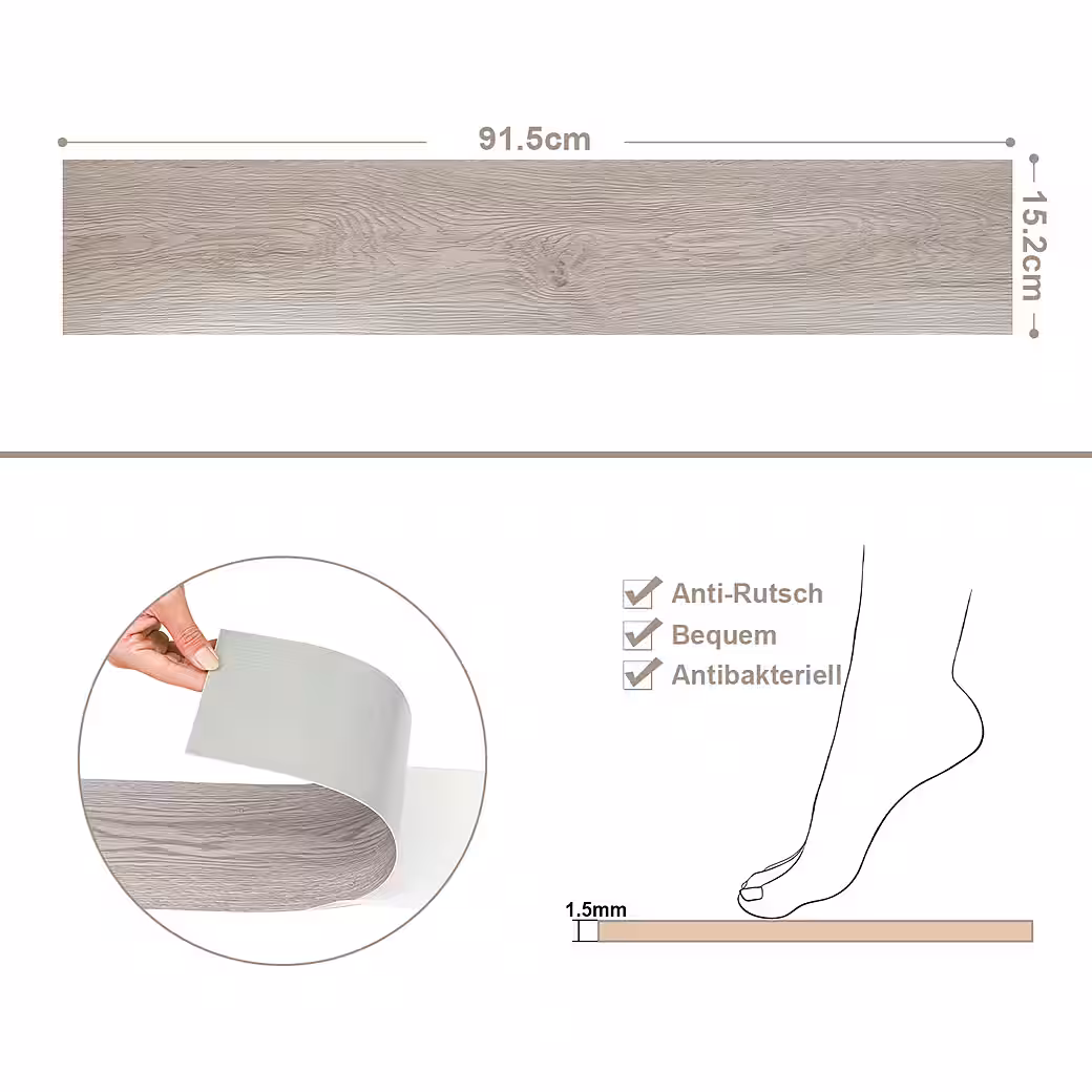 - Decor: Self-adhesive – Antistatic – Non-slip – Antibacterial – Textured for a natural look – Suitable for underfloor heating and damp rooms – Pleasantly warm and quiet