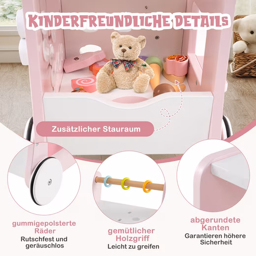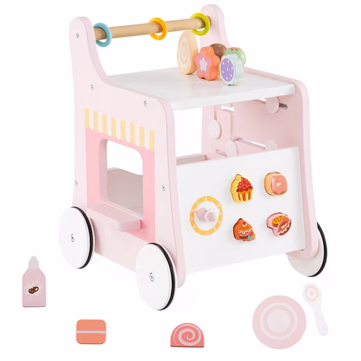 This multifunctional walker offers your toddler endless fun. A colorful side window encourages imaginative role-playing. Designed with safety in mind, the walker features smooth, rounded edges and is made of sturdy MDF. The large wheels are padded with non-slip, quiet rubber. The comfortable wooden handle is easy to grip. A spacious storage compartment beneath the play surface is perfect for organizing toys. Ideal for children aged 1 and up, this activity center, with its child-friendly details, promotes creativity, imagination, motor skills, and hand-eye coordination, making it a cherished companion throughout your child’s early years.