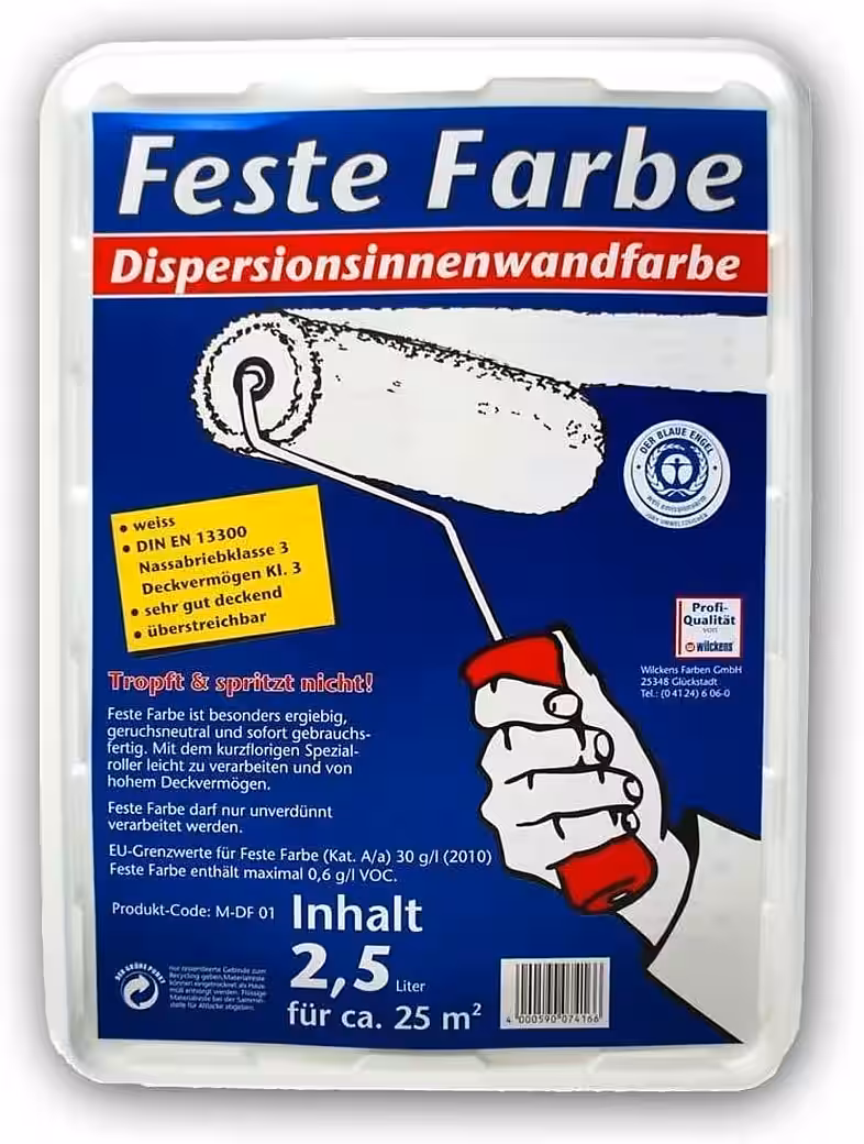 Wilckens’ solid paint has a white hue and is ideally suited for painting all types of plaster, hardboard, wallpaper, concrete, exposed concrete, and masonry. This Wilckens brand paint is solvent-free, easy to apply, and characterized by its high opacity and low spattering tendency. Once dry, the paint is breathable and has a matte finish.