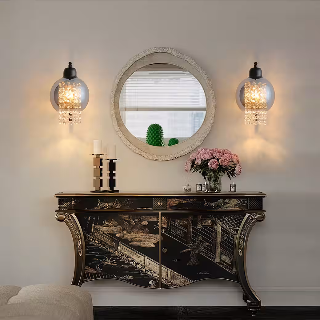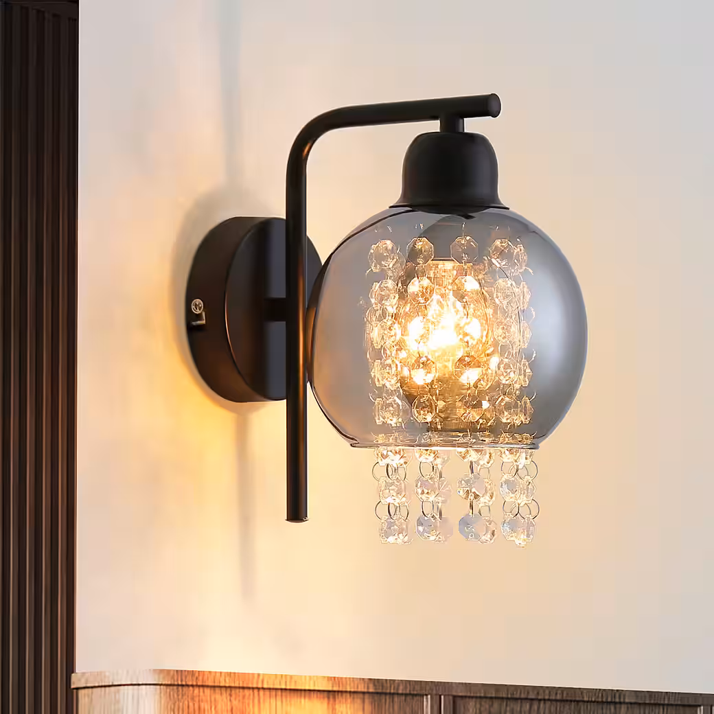 Wall light, smoke grey, glass globe, crystal, E27, indoor bedroom, modern hallway lamp