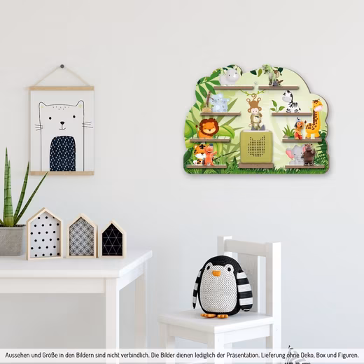 - Enchanting shelf with adventurous jungle motif for Tonie box & figures | Size: 55x41cm| 10mm MDF | incl. 40 self-adhesive metal plates for magnet. Liability of the Tonies