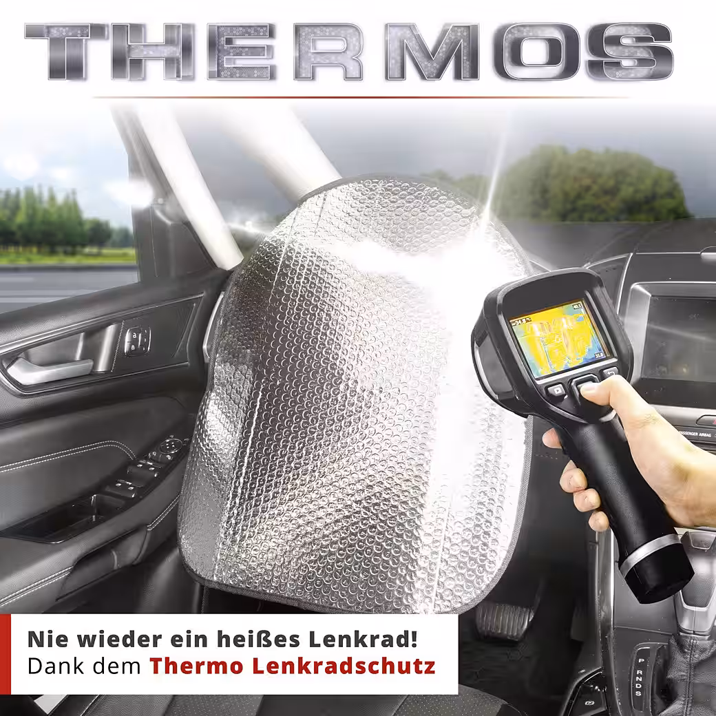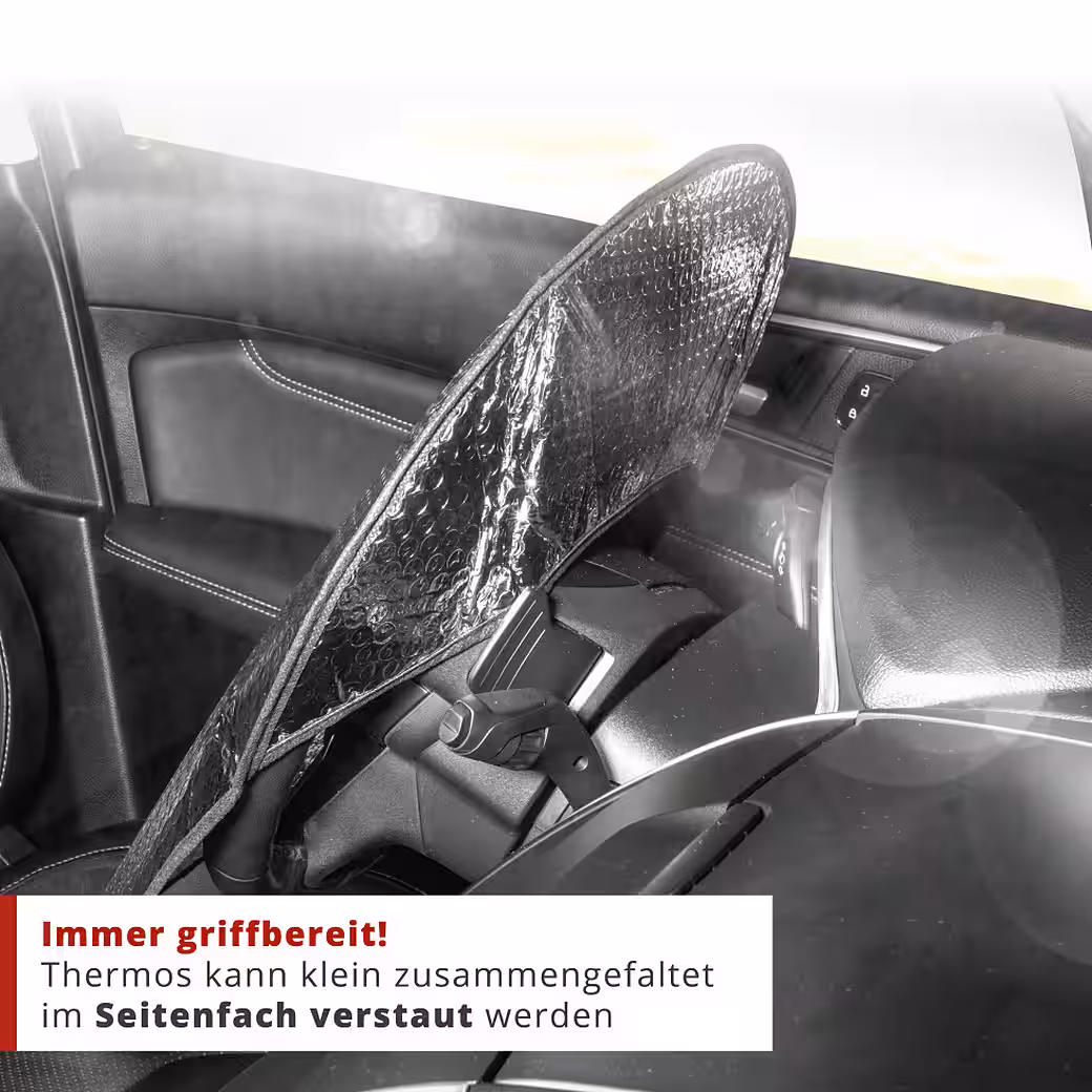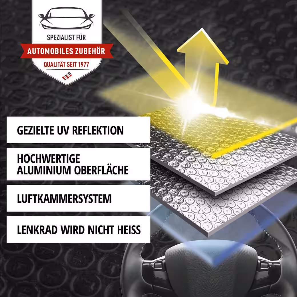 Universally compatible with all common vehicles | up to a steering wheel diameter of 42 cm | Color: silver | protects against UV rays and heat | easy installation | high-quality aluminum surface | air chamber system |