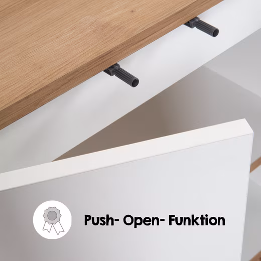 Discover the MORENA vanity unit in stylish basalt gray/artisan oak, a real eye-catcher in your bathroom that also offers plenty of practical storage space. This bathroom series combines timeless design with modern functionality, creating a harmonious atmosphere in your bathroom. Made in Europe from high-quality chipboard with robust ABS edges, this cabinet guarantees durability and easy maintenance. The combination of artisan oak and an elegant gray finish complements any bathroom – whether classic or modern. The solid wood feet with a foil finish provide a stable base and add a warm, inviting touch. A true highlight is the push-open doors, which allow for handle-free opening, ensuring a clean and uncluttered look.