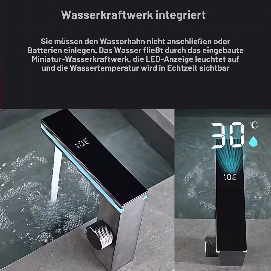 - Intelligent temperature monitoring: The faucet features a digital display that shows the water temperature in real time. It requires no electrical connection as it is powered by environmentally friendly hydropower.