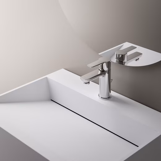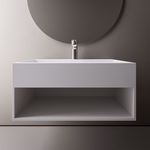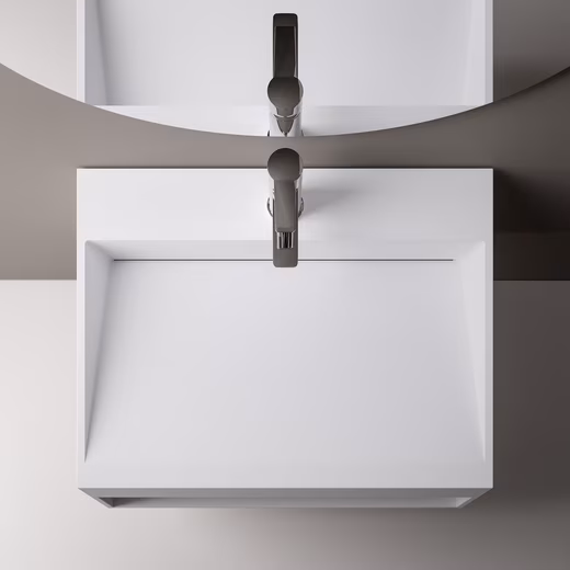 TWG71 wall-mounted washbasin in mineral cast Solid Stone – matt white – with storage compartment TWG71 is a compact washbasin with a useful storage compartment for towels and toiletries. The soap dispenser finds its place on the tap hole bench. In our bathroom shop you will find matching washbasin fittings. The pool is available in widths of 60 cm and 80 cm. Specifications Material Mineral casting Solid Stone Colour White matt Shape Square Dimensions selectable 60 x 46 x 28 cm (W x D x H) 80 x 46 x 28 cm (W x D x H) Weight 60 cm: Net 28 kg / Gross 31 kg 80 cm: Net 31 kg / 34 kg Dimensions Packaging 60 cm: 65 x 51 x 33 cm 80 cm: 85 x 51 x 33 cm With drain channel With storage compartment Suitable for countertop and concealed fittings (fitting hole not pre-drilled) Smooth and non-porous surface (antibacterial) Colour fastness With pre-drilled holes for wall mounting DIN connection Without fitting Without overflow Without decorative items