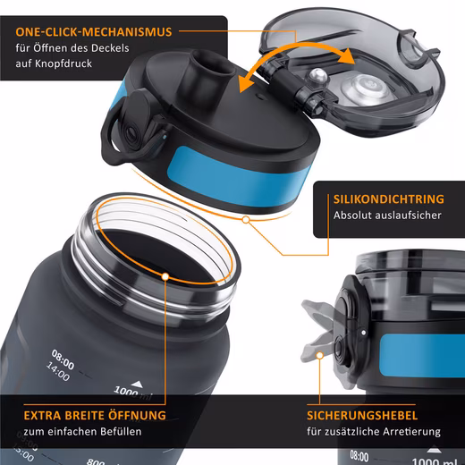- 1.0 L water bottle with time markers & motivational icons | reliably reminds you to drink water | ideal for sports | office | school | fitness | on the go