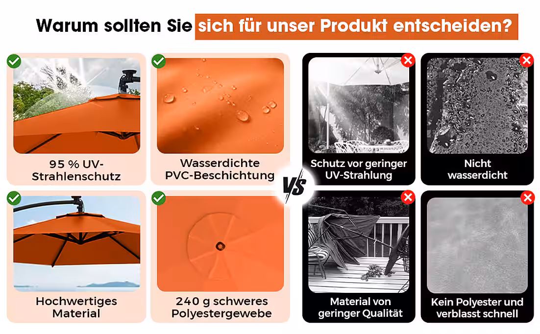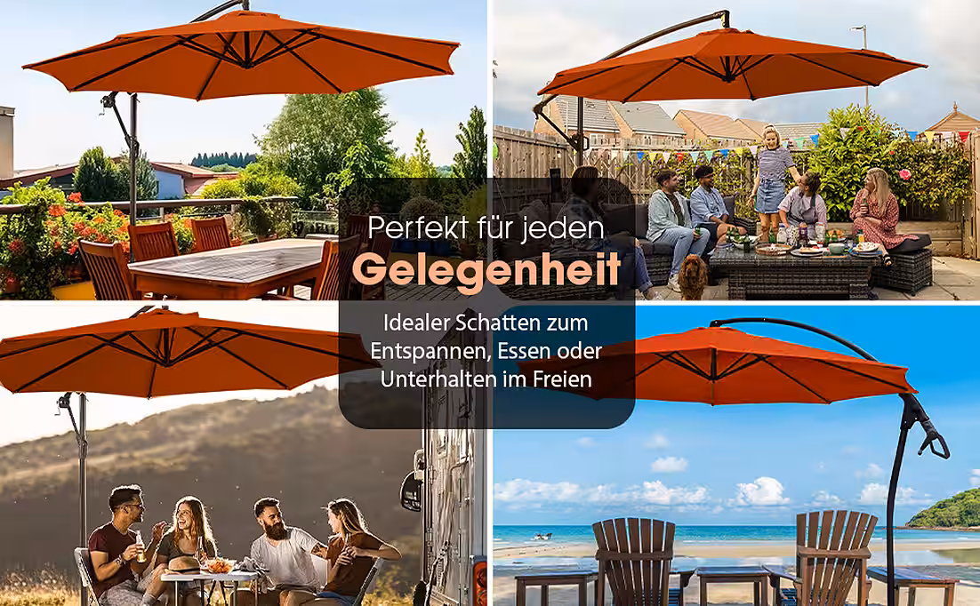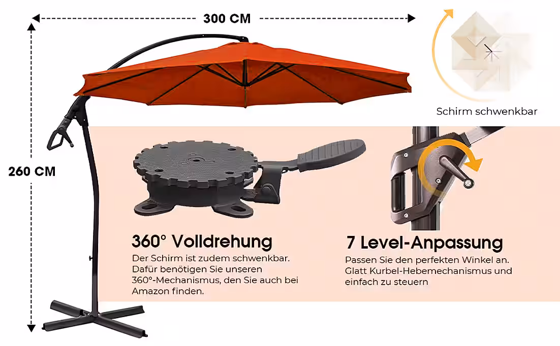 - The parasol can also be made swiveling. For this, you will need our 360° mechanism, which is also available at Otto. The 360° mechanism is not included in the delivery.